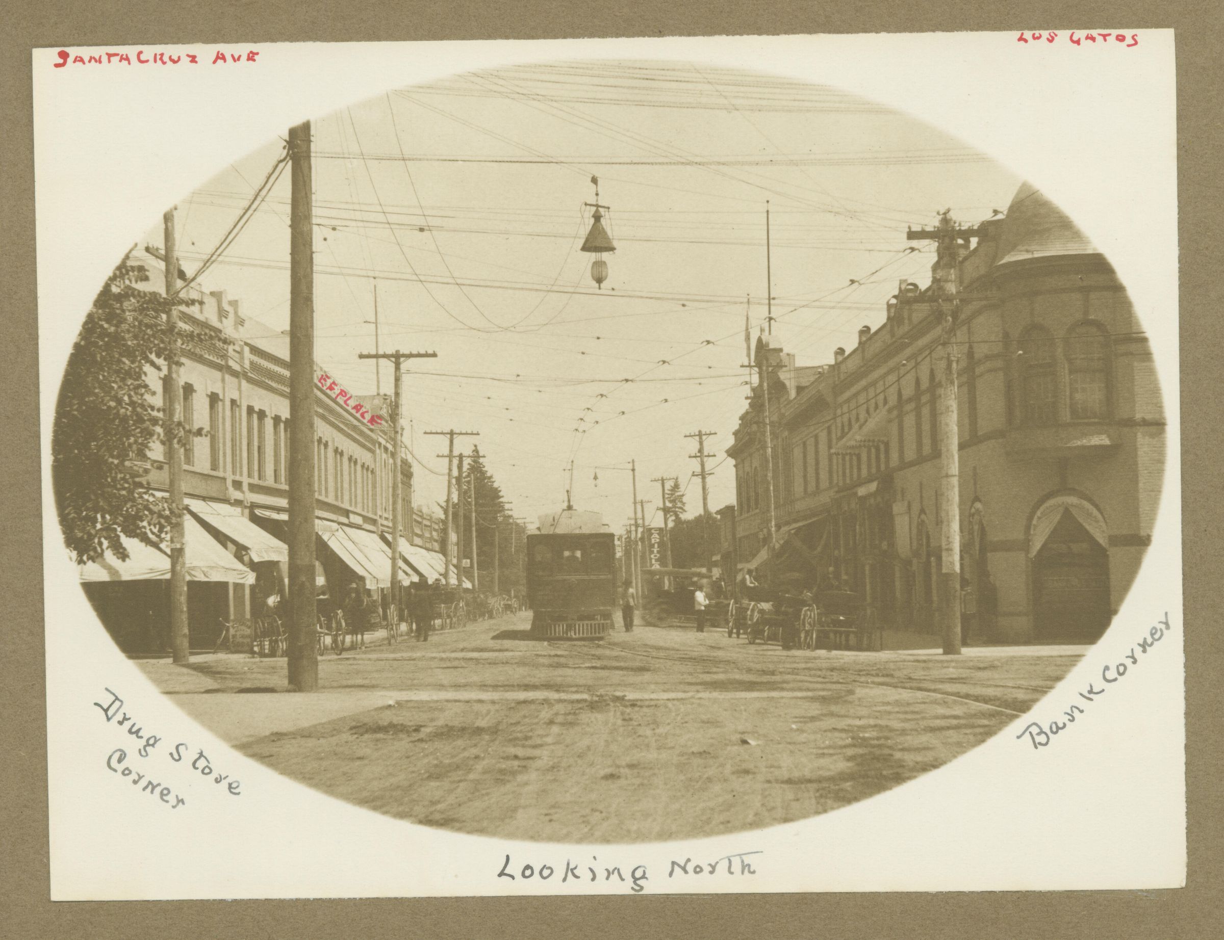 Wagner photo album photograph of Santa Cruz Avenue at Main Street looking north with drug store corner, bank corner and interurban trolley. WAG024Collection