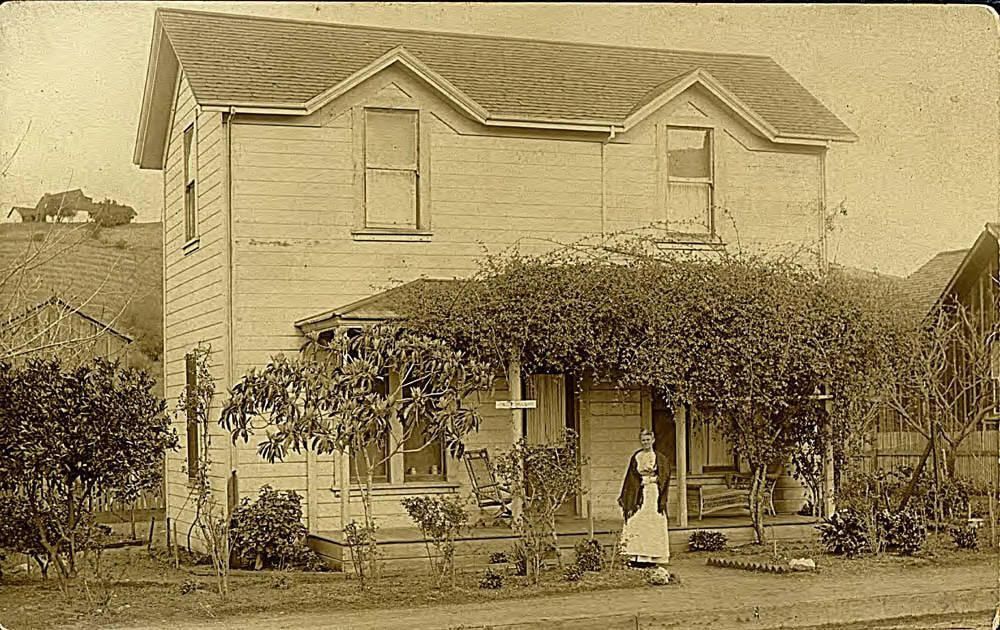 Sarah Amanda (Crews) McCoy is shown standing in front of her home at 201 Johnson Avenue and Cross Way (formerly Wright) in Los Gatos. In 1892, Sarah A. McCoy and Phillip P. Crews filed a suit against Charles M. Beckwith seeking to eject him from the possession of a certain lot in Los Gatos. Mcc001Collection