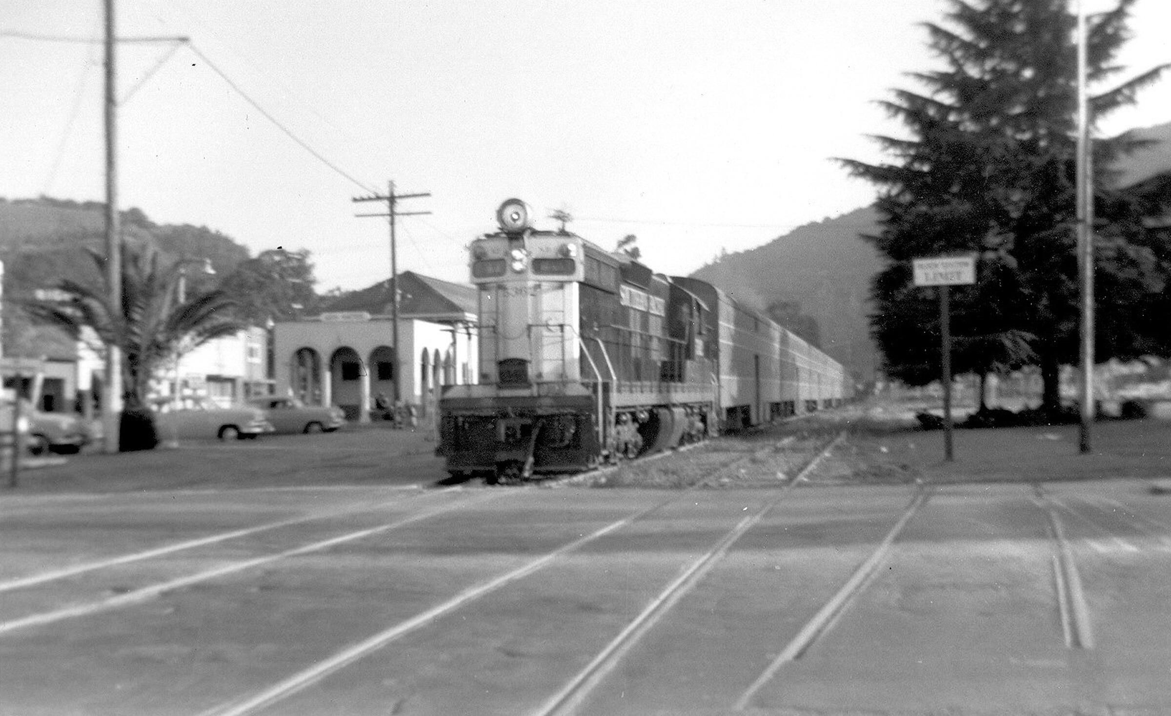 In contrast to the ornate wood-burners that first served the line, SD9 No. 5362 leads a train of modern, double-deck Gallery cars in this c. 1958 view. Similar to the cars currently in use on CalTrain, Gallery cars were typically featured on evening commutes while the older "Subs" made up morning trains. CHS001Collection