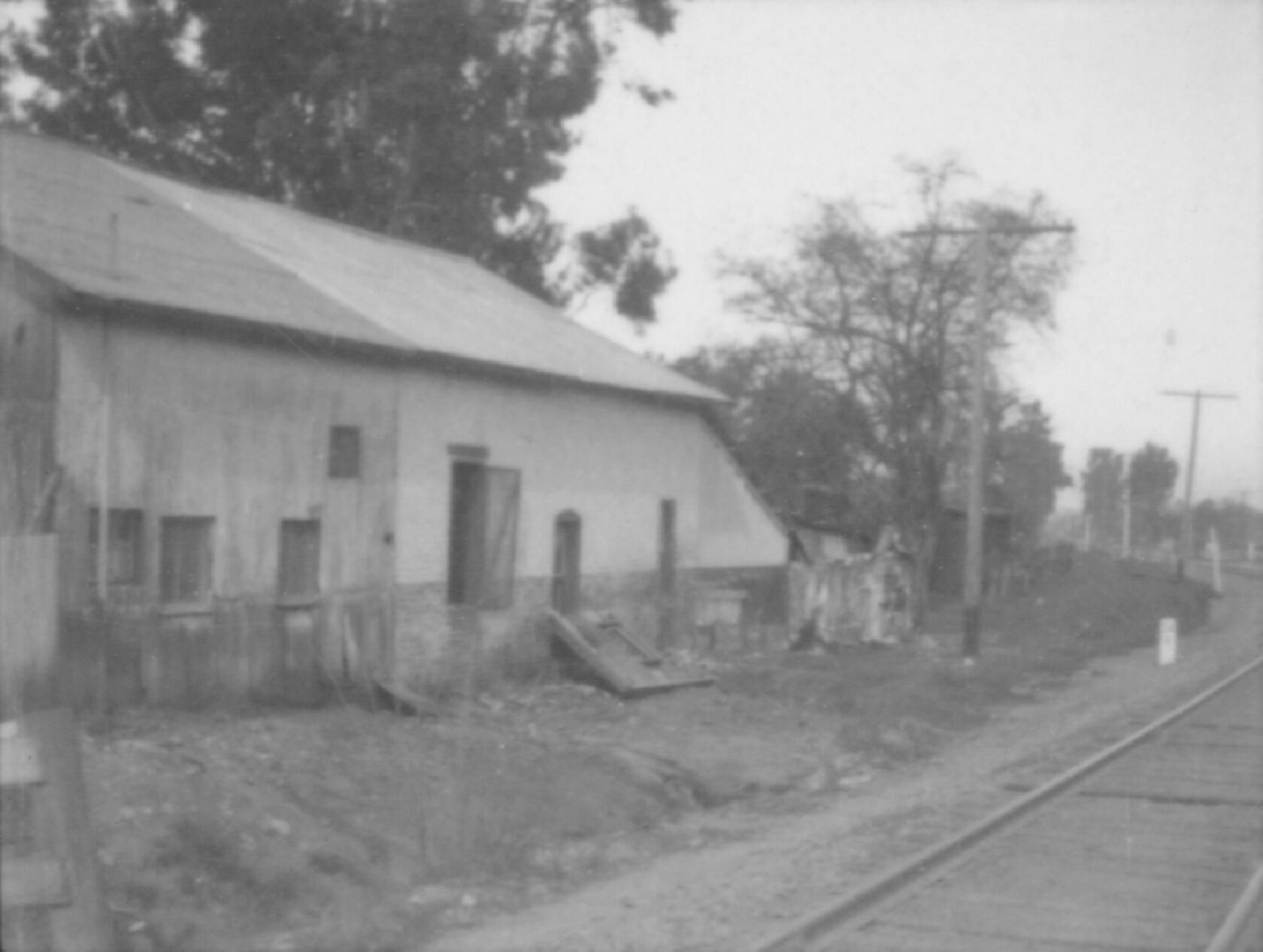 View of building that backs onto Southern Pacific Railway tracks, at north edge of town.