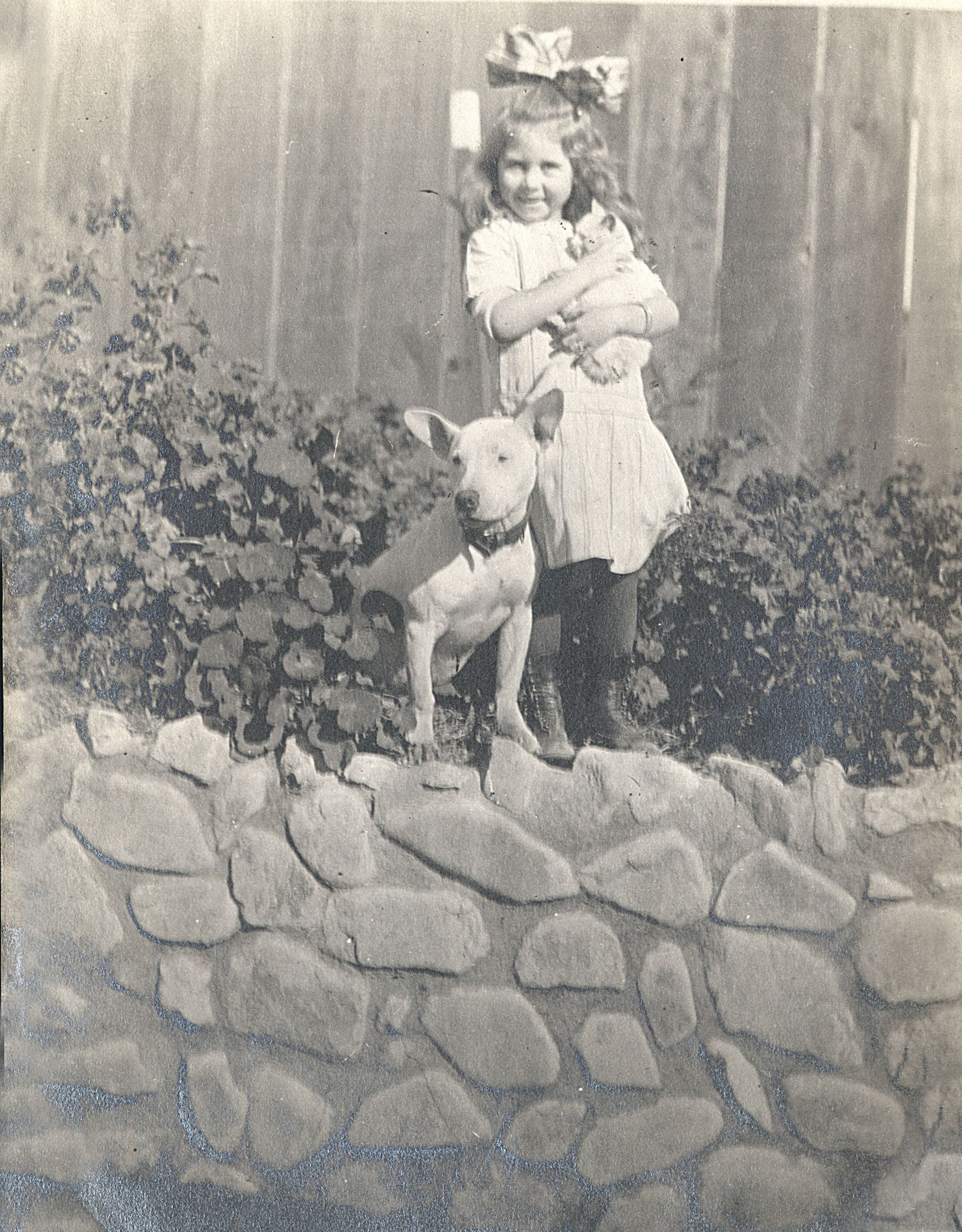 Ione is standing in her mother Nellie's nasturtium flower garden below the family home at 36 Park Avenue. The retaining wall, constructed of Los Gatos Creek stones, was one of many that encompassed the large grounds of the Shore family property on Park Avenue. The family's Victorian home was built by Ione's grandfather W. C. Shore as a wedding gift for Junius Dalton (Dick) Shore and Nellie Taylor, who were married in 1897 in the Methodist Episcopal Church in Los Gatos. Ione was the couple's third child and married Duane Muth. They had one child, Nelma Ray Muth. Ione had one sister, Wanda, and two brothers, Melville and Lisle. SHU001Collection