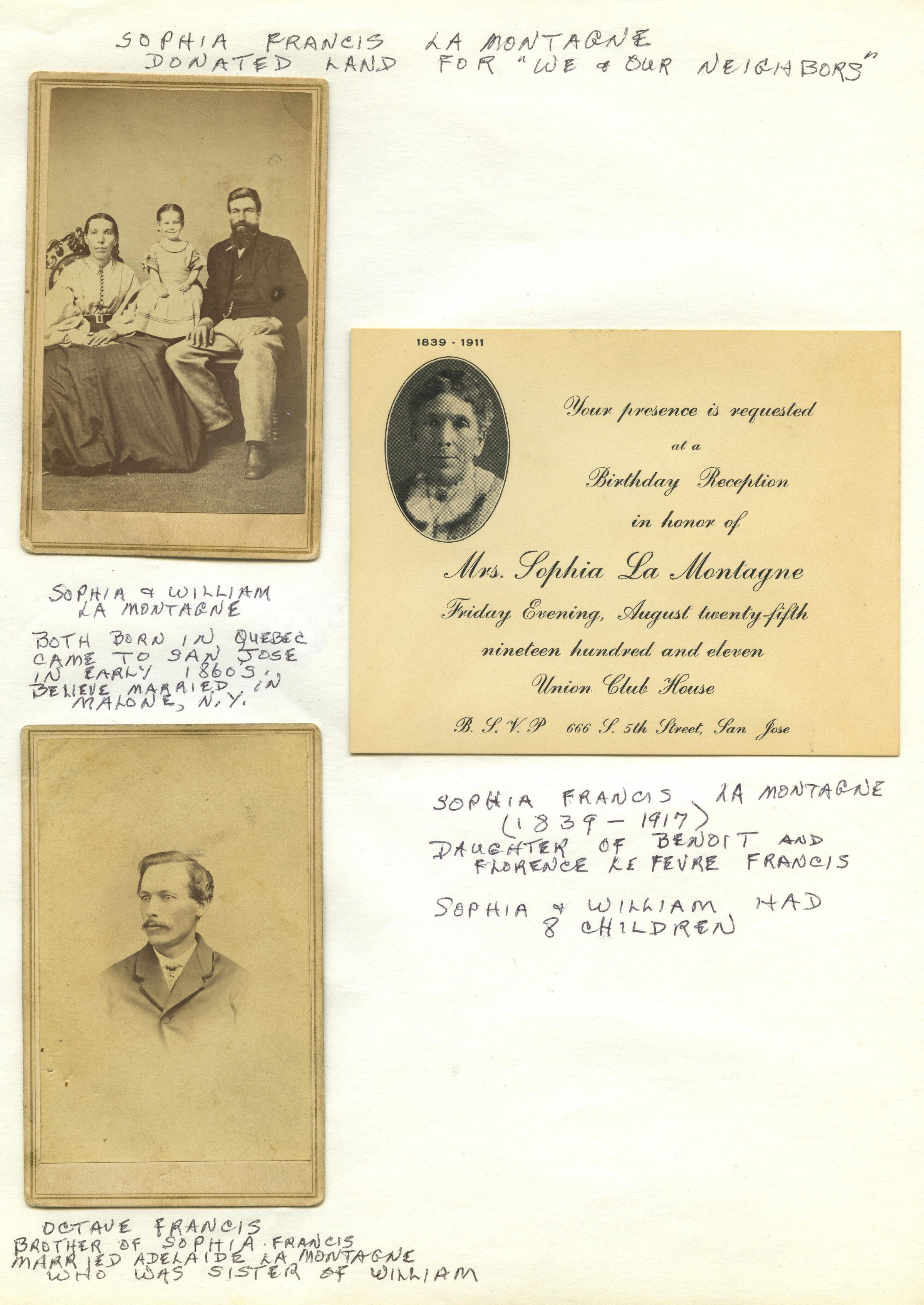 Sophia (Francis) La Montagne sister of Octave Francis donated land for We and Our Neighbors Club house. She was born in 1839 and died in 1917. Her parents were Benoit and Florence Le Fevre Francis. Sophia had 8 children with husband William.Collection