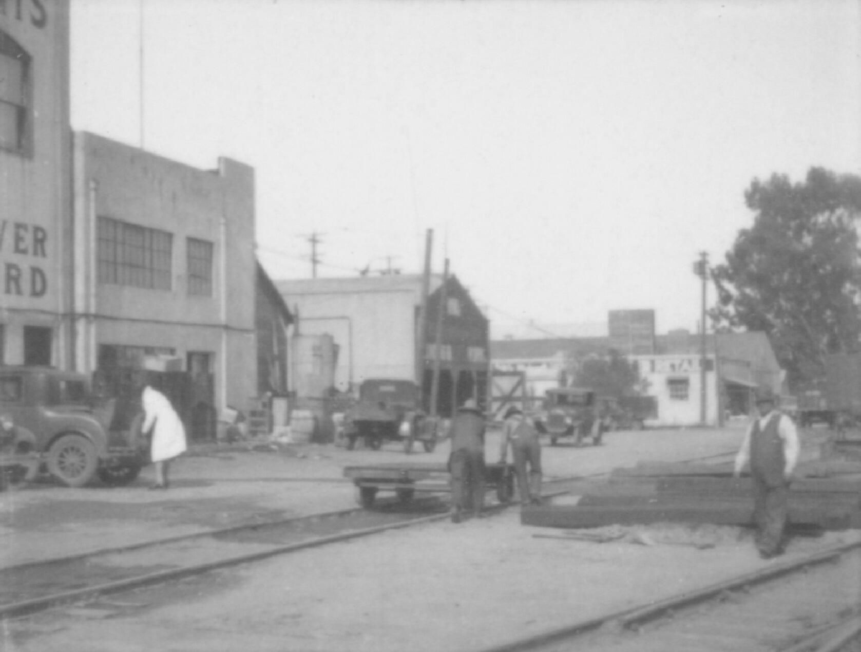 Rear entrance of businesses fronting on No. Santa Cruz Ave., showing workers and autos.Collection