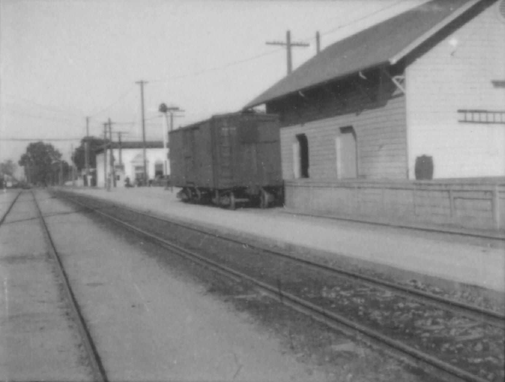 Railway depot south of Main Street, looking north. White building in background is First National Bank at 112 W. Main St.Collection