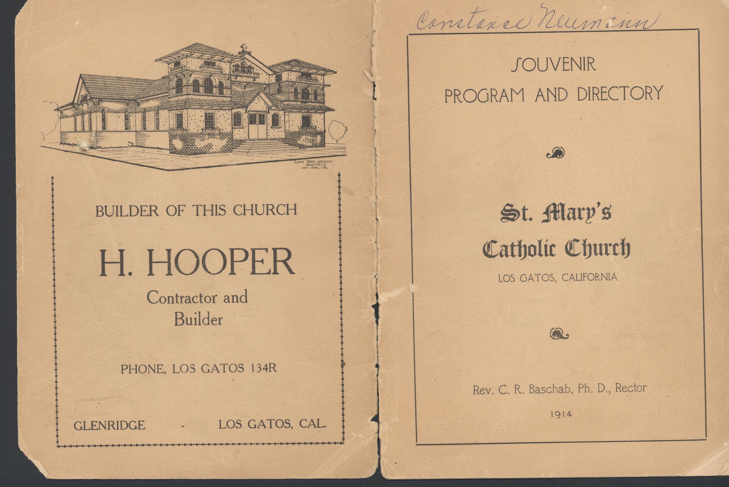 Cover of St. Mary's Catholic Church, Los Gatos, Program & Directory. The front page also includes pastor's name and date of issuance. The name "Constance Neumann" is inscribed at the top of the page. The back cover page shows a drawing of St. Mary's Church, as well as the name, phone number, and street address of the contractor and builder of the church. STM007Collection