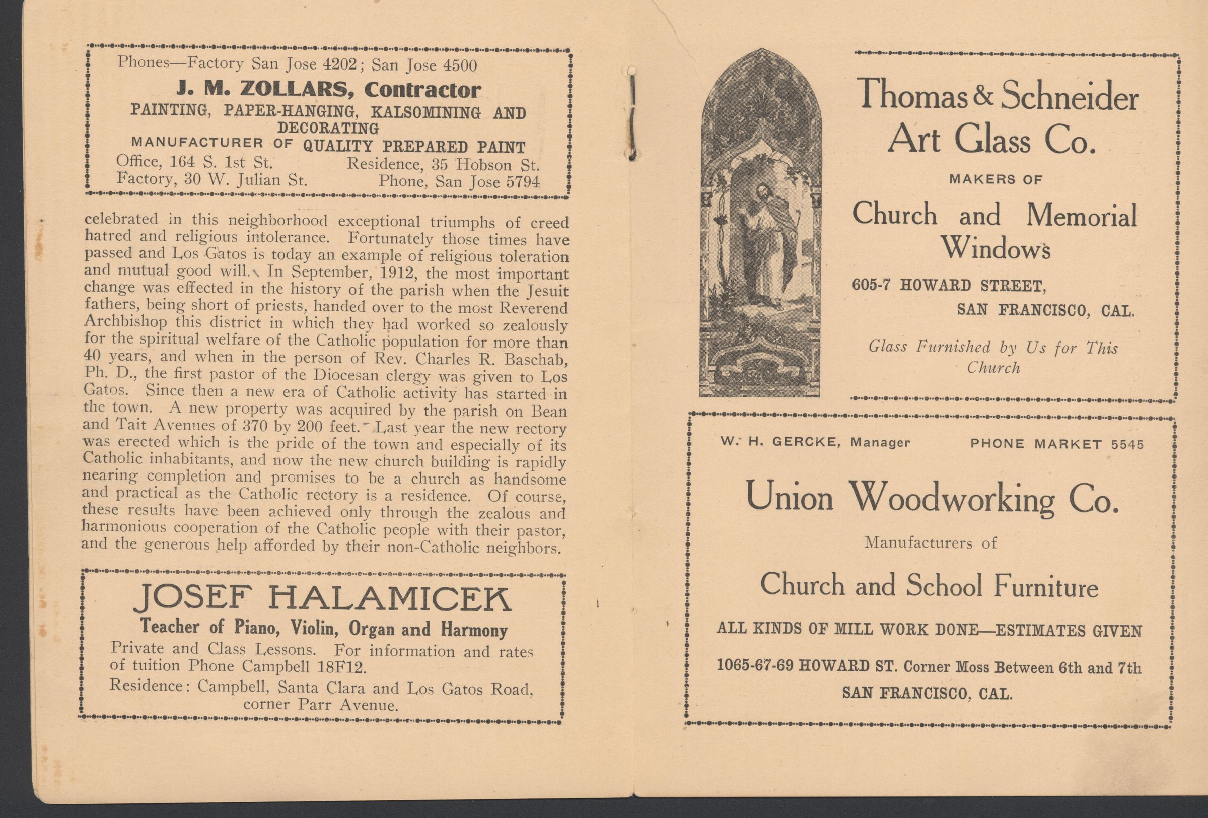 The history of the Parish is continued on the left-hand page, and there are ads for a contractor, a music teacher, a church windows maker and a manufacurer of church & school furniture. STM011Collection