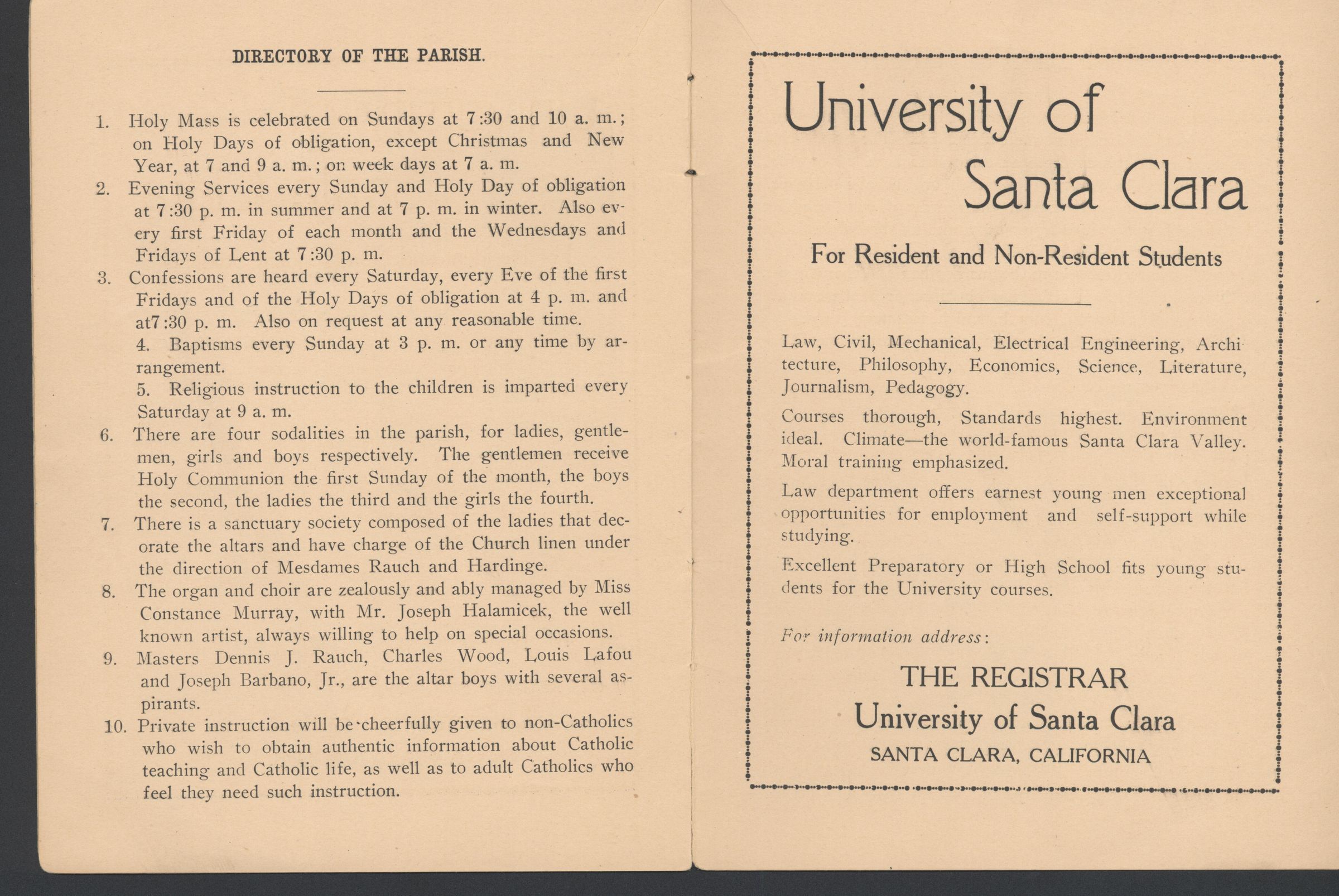 Left-hand page is the Directory of the Parish, listing information about days and hours of services; parish lay organizations; religious instruction. The right-hand page is an advertisement for University of Santa Clara, listing the courses offered; the fact that the Law Department offers jobs for their students; and that there are high school courses offered for those wishing to attend the University. STM012Collection
