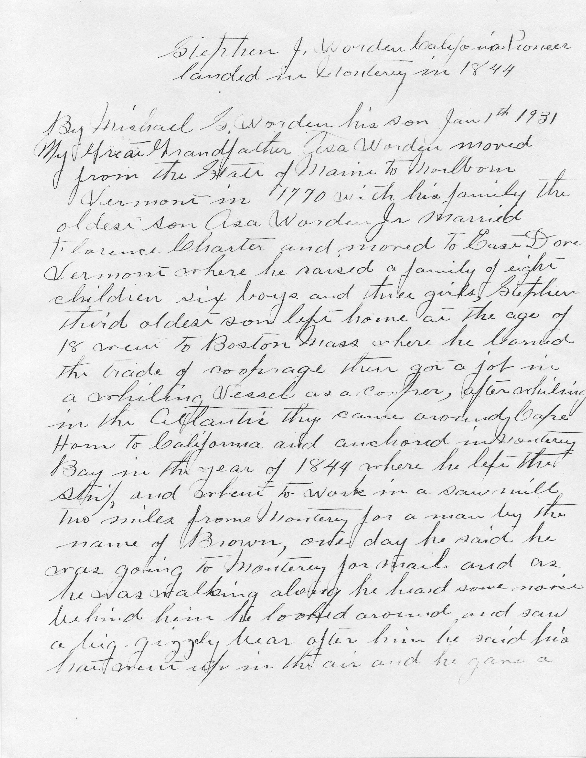 Stephen J. Worden, California Pioneer Original Handwritten Memoir Page 1Entry/Object ID