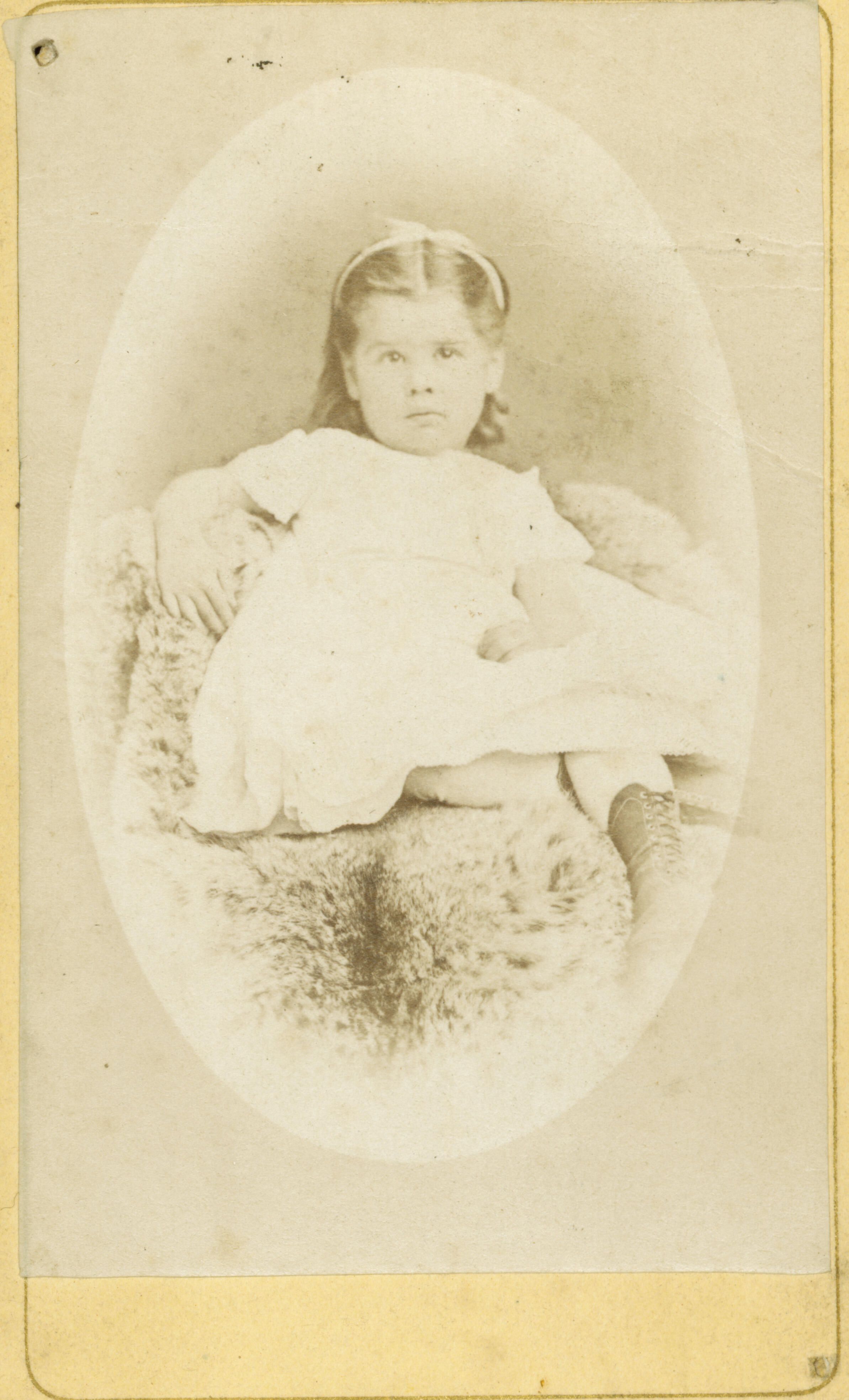 Portrait of Virginia (1869 - 1939) as a child. She later became Virginia Stocker Leighton Brown. She was Lucile Franks' mother and Bruce Franks' grandmother. In later life, Virginia lived at 125 Tait Avenue with her sister Susan Stocker Simon, probably after divorcing her two husbands. FRA030Collection