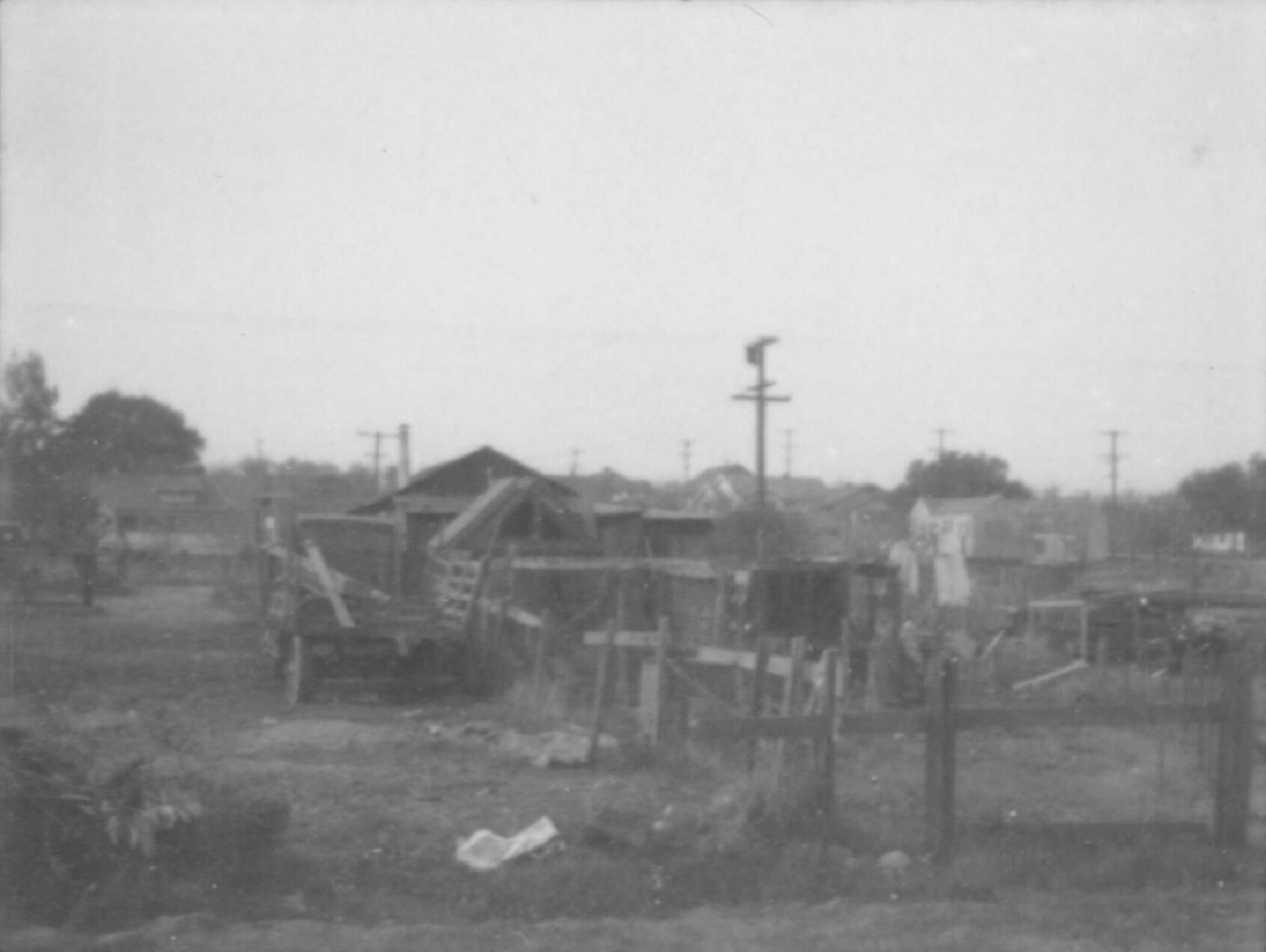View of residences and tumbledown sheds that (probably) are along the Southern Pacific Railway tracks;flatbed truck parked in yard.Collection