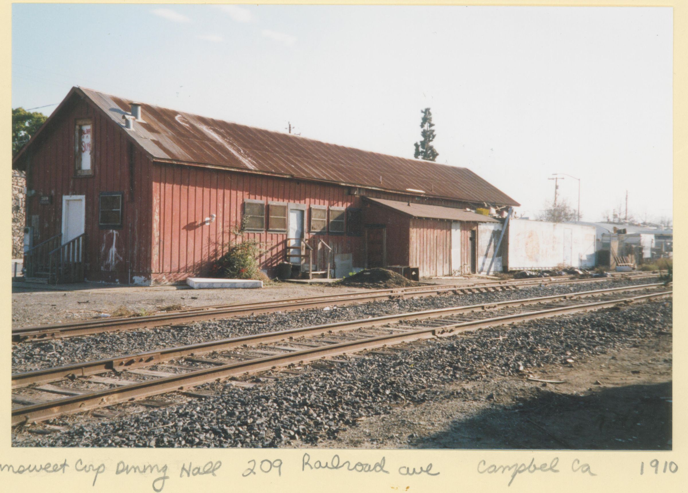 View of Sunsweet Packaging's dinning hall on the west side of Lincoln Avenue in San Jose and on the south side of the right-of-way of the South Pacific Coast (S.P.C.) and Southern Pacific (S.P.) railroads. The building was built ca. 1910 LEI039Collection