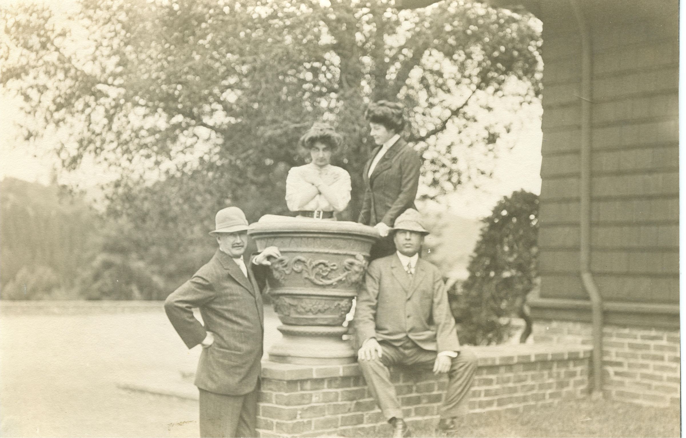 Four people around giant urn at Tevis Estate. Dr. Harry L. Tevis is on the left. NVC006Collection