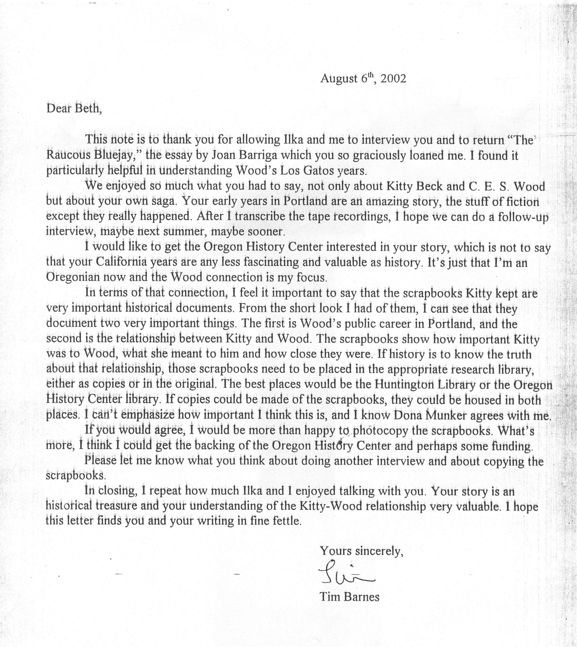 Thank you letter to Beth Grover Rondone from author Tim Barnes. RON022
