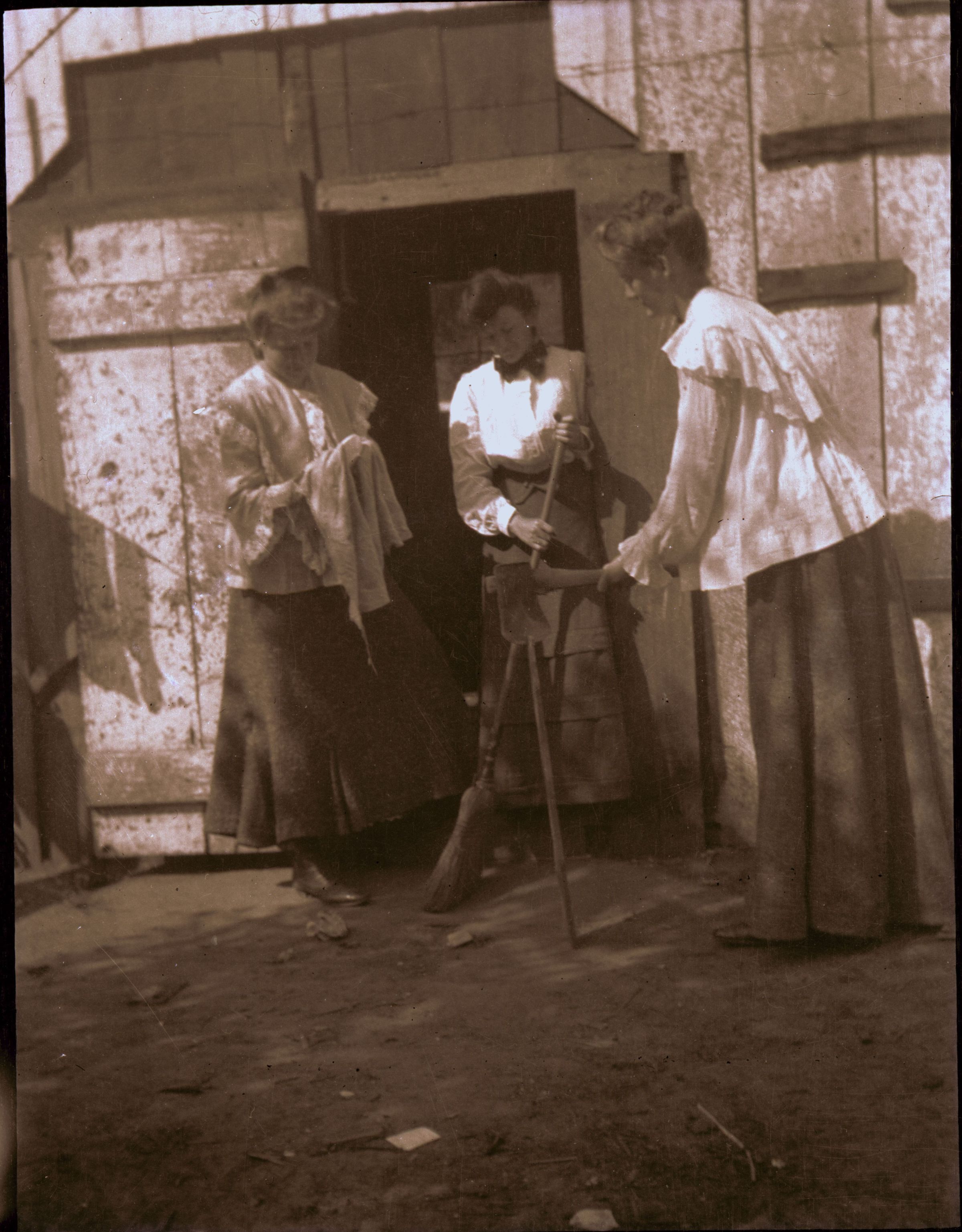 Three women in apparent theatrical setting. One seems to be splitting broom handle with an axe. MUS014Collection