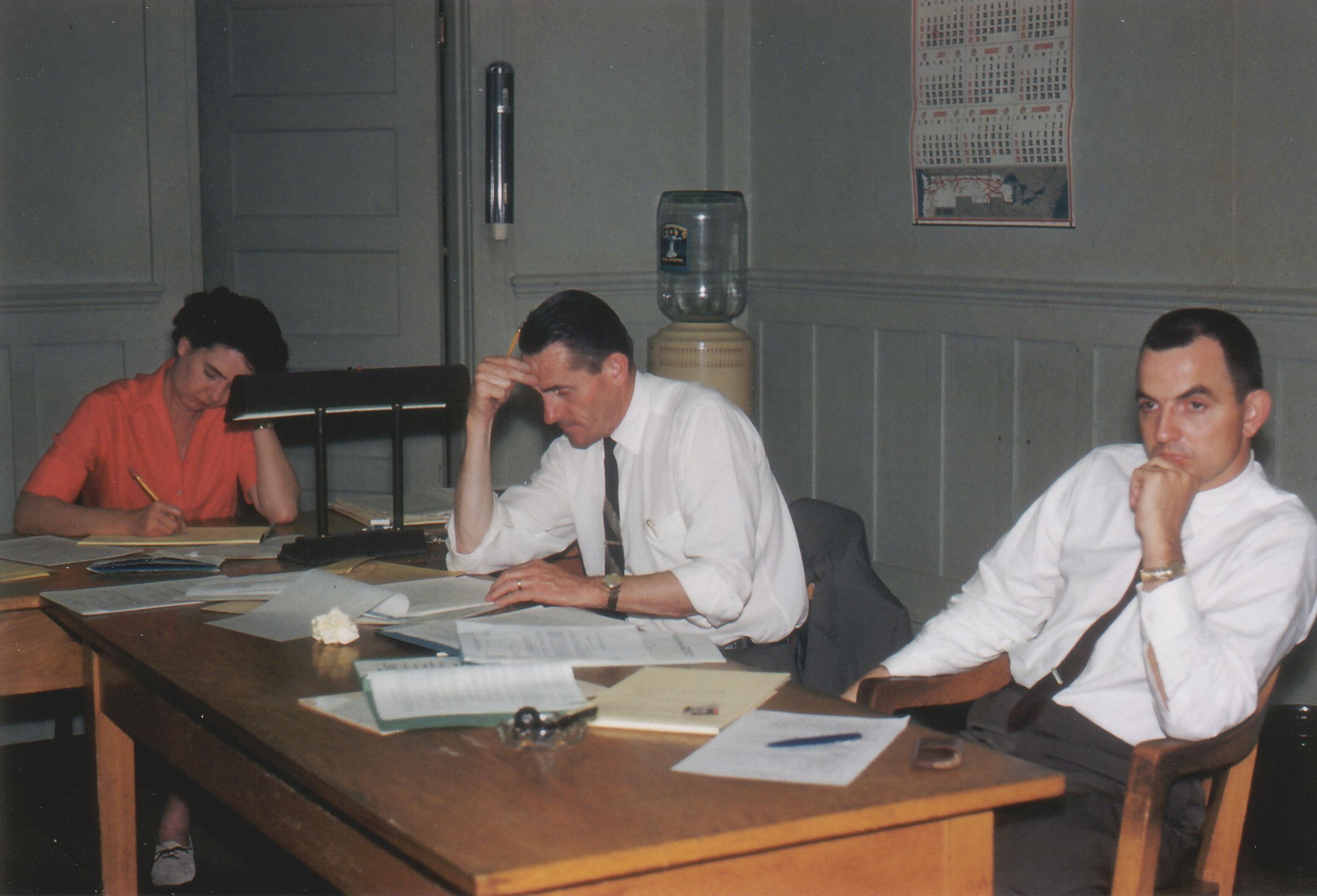 Town staff at a Town Council meeting. Left to right: Town Clerk Beverly Blatnick, Town Engineer Emmett Brady, and Town Manager Donald McIntyre. EJ006Collection