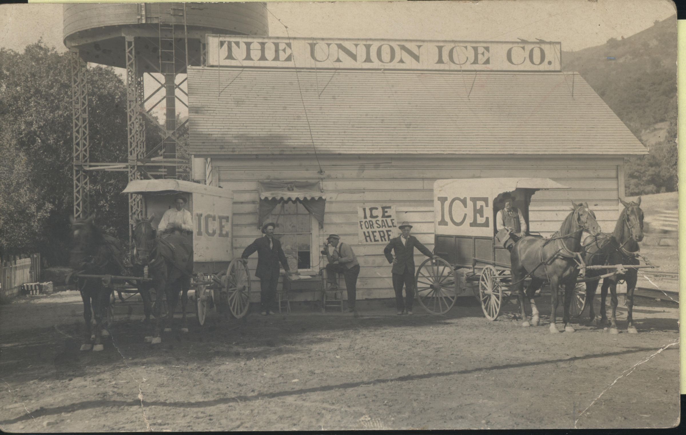 William C. Shore's Union Ice Company was founded in 1884 near the railroad depot. Joe Mendosa is the employee driving the wagon on the left, and William's son, Dick Shore, is standing at the center of the photograph with his hand on the wheel. Notice the man talking on an early telephone. The water tank in the background refreshed wood and coal-burning steam engines before they started on the journey over the Santa Cruz Mountains. BDG066Collection