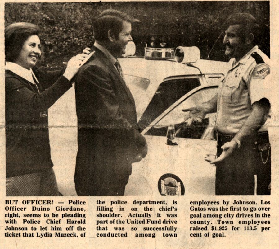 Los Gatos news article about United Fund drive. In the photo, from the left: Lydia Muzeck, of the Police Department; Police Chief Harold Johnson, and Police Officer Duino Giordano. LAW032Collection