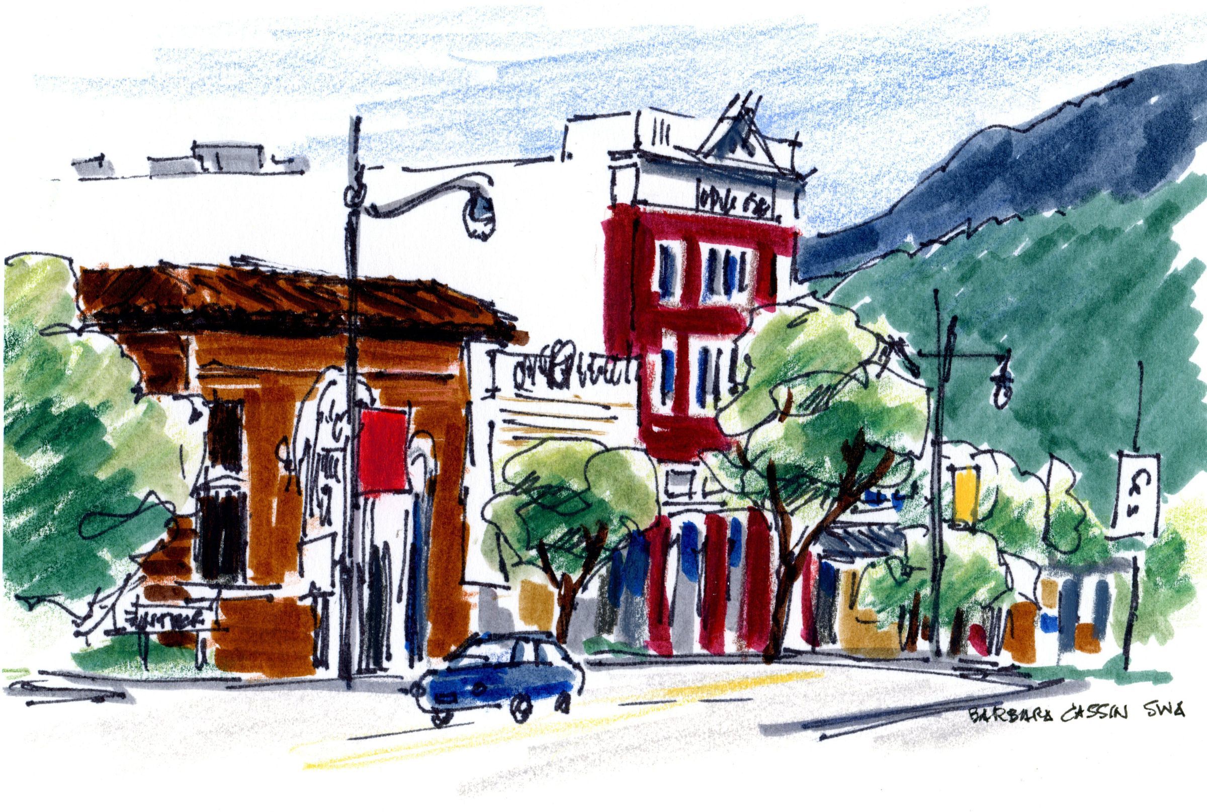 Main Street, near the railroad right-of-way, showing the bank building on the left and Crider's Department Store on the right.Type of Painting