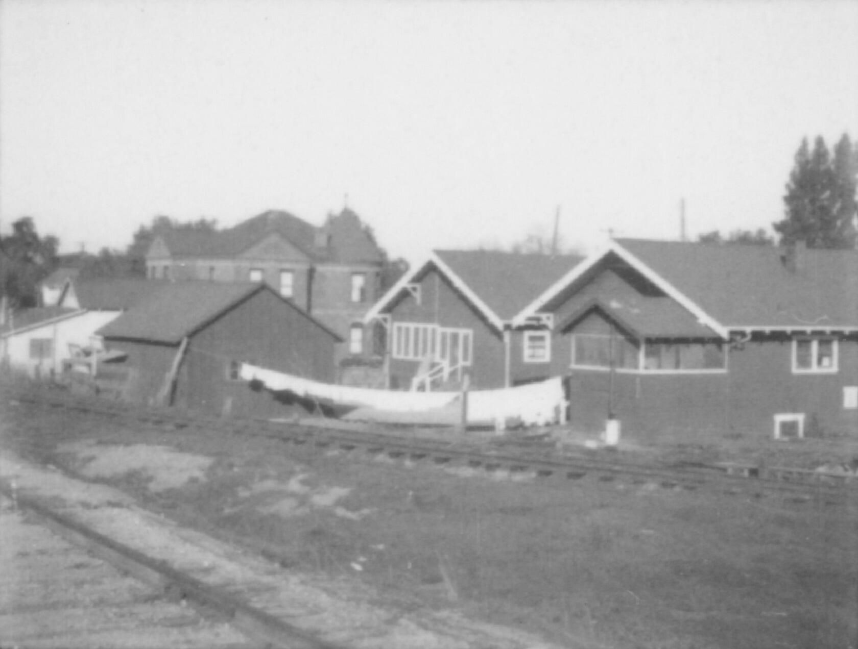 Rear view of unknown residences along Southern Pacific Railway tracks. Laundry drying on a clothes line is in one backyard. Brick residence in background, with round tower, is 315 University Avenue, at that time owned by Rees and Donaldina Scott, who lived there with their daughter Nellie.Collection