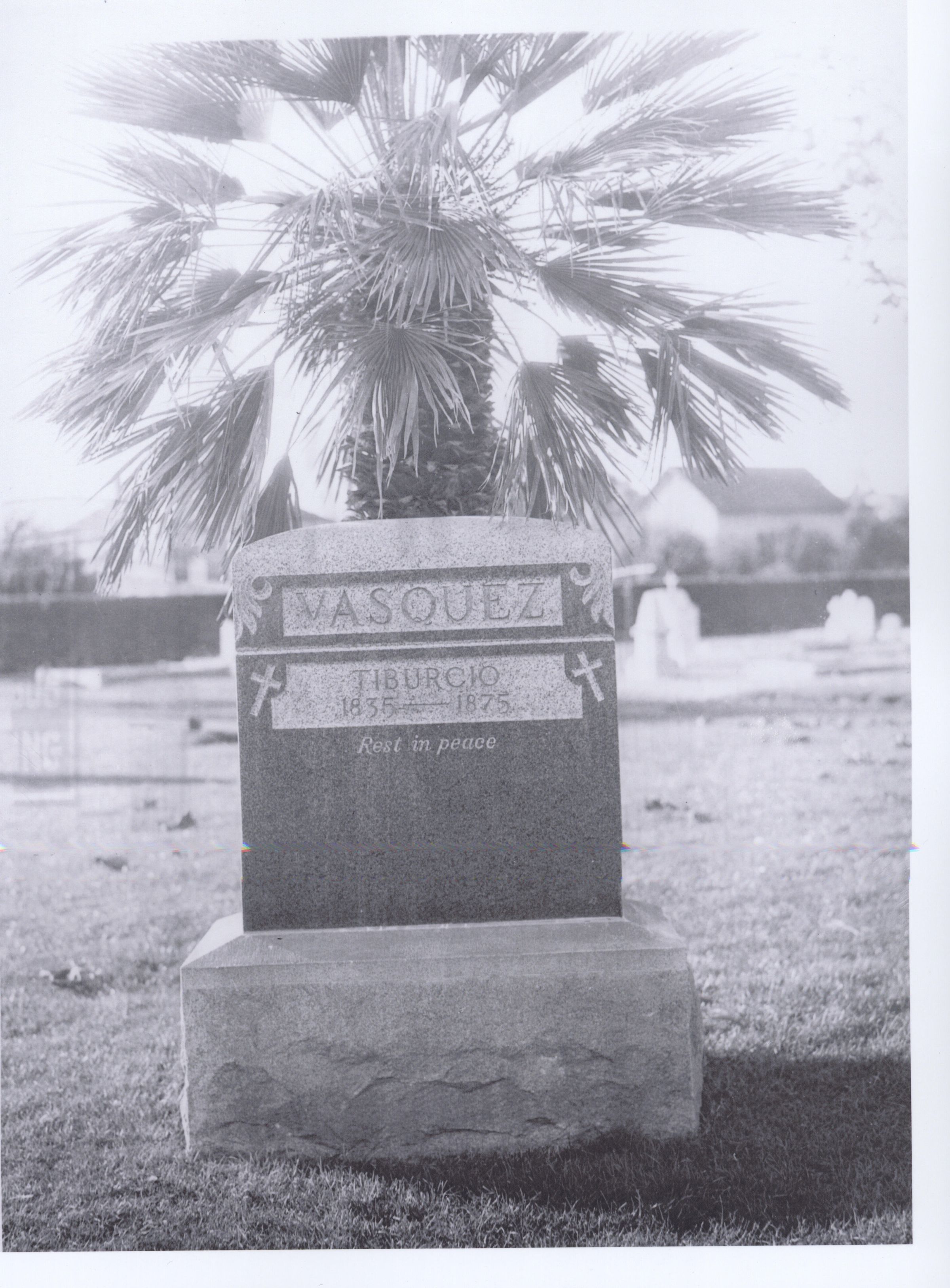 Tombstone of Tiburcio Vasquez, known as the "Lover Bandit." His career in crime started at age 16, and he was often protected in flight by women he had charmed. He was caught and hanged in the yard of the Santa Clara county jail on March 19, 1875. PE075Collection