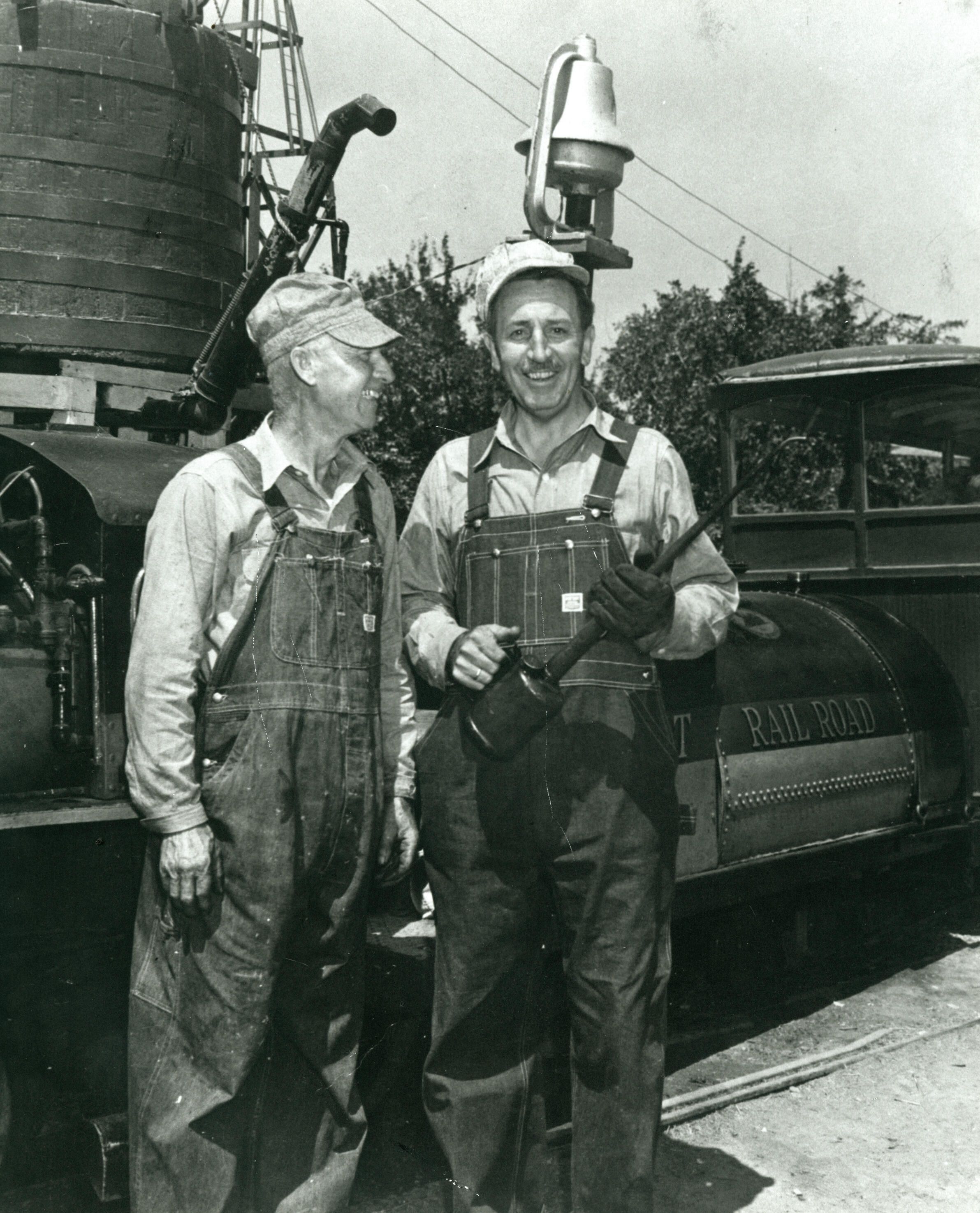 During the early 1950s, Walt Disney (right)visited a number of parks to gather ideas for Disneyland, which opened in Anaheim in 1955. He was sure of one thing: He wanted a train to encircle his park. Disney stopped by Los Gatos to see Billy Jones' Wildcat Railroad, a narrow-gauge steam operation, and the two men became friends. They are seen here on the Jones ranch. JON123Collection
