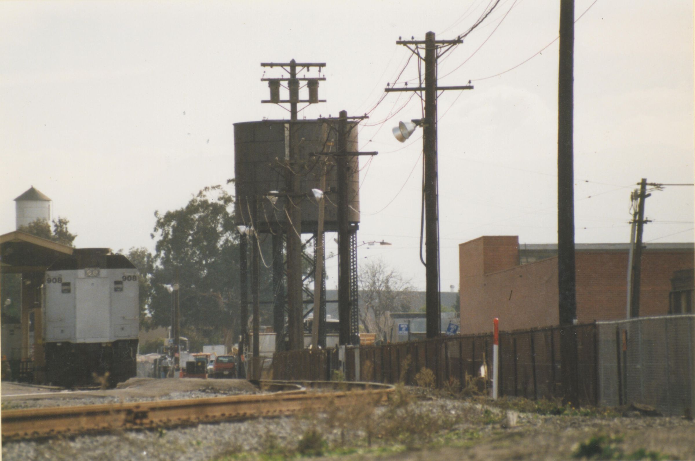 A view of the water tower near the San Jose main depot once used by steam locomotives traveling on the South Pacific Coast (S.P.C.) and Southern Pacific (S.P.) right-of-way. LEI032Collection