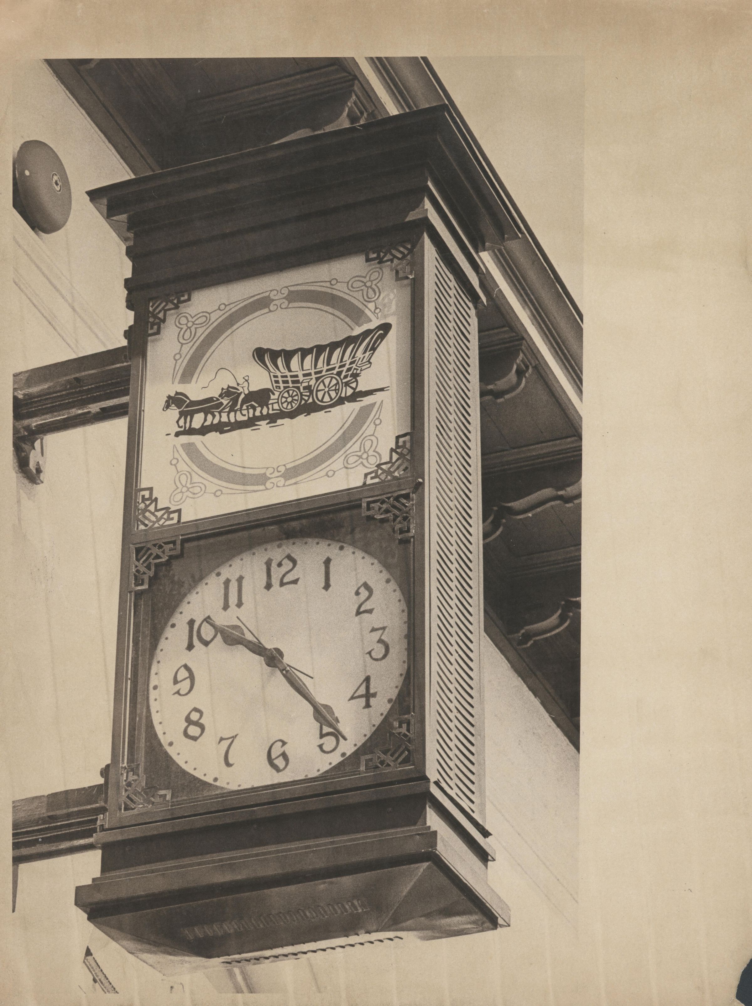 The First National Bank was organized in 1911. It originally occupied a building on the south side of Main Sreet. In February 1912 it moved to the Fretwell Building on the corner of University Avenue and Main Street. In 1918 the First National Bank purchased the building adjacent to the railroad tracks on the north side of Main, and constructed this building in 1920. The bank, reorganized in the 1930s, was later purchased by the American Trust Company which subsequently merged with Wells Fargo Bank. The illustration in the upper section of this clock represents the Wells Fargo Bank logo.Collection