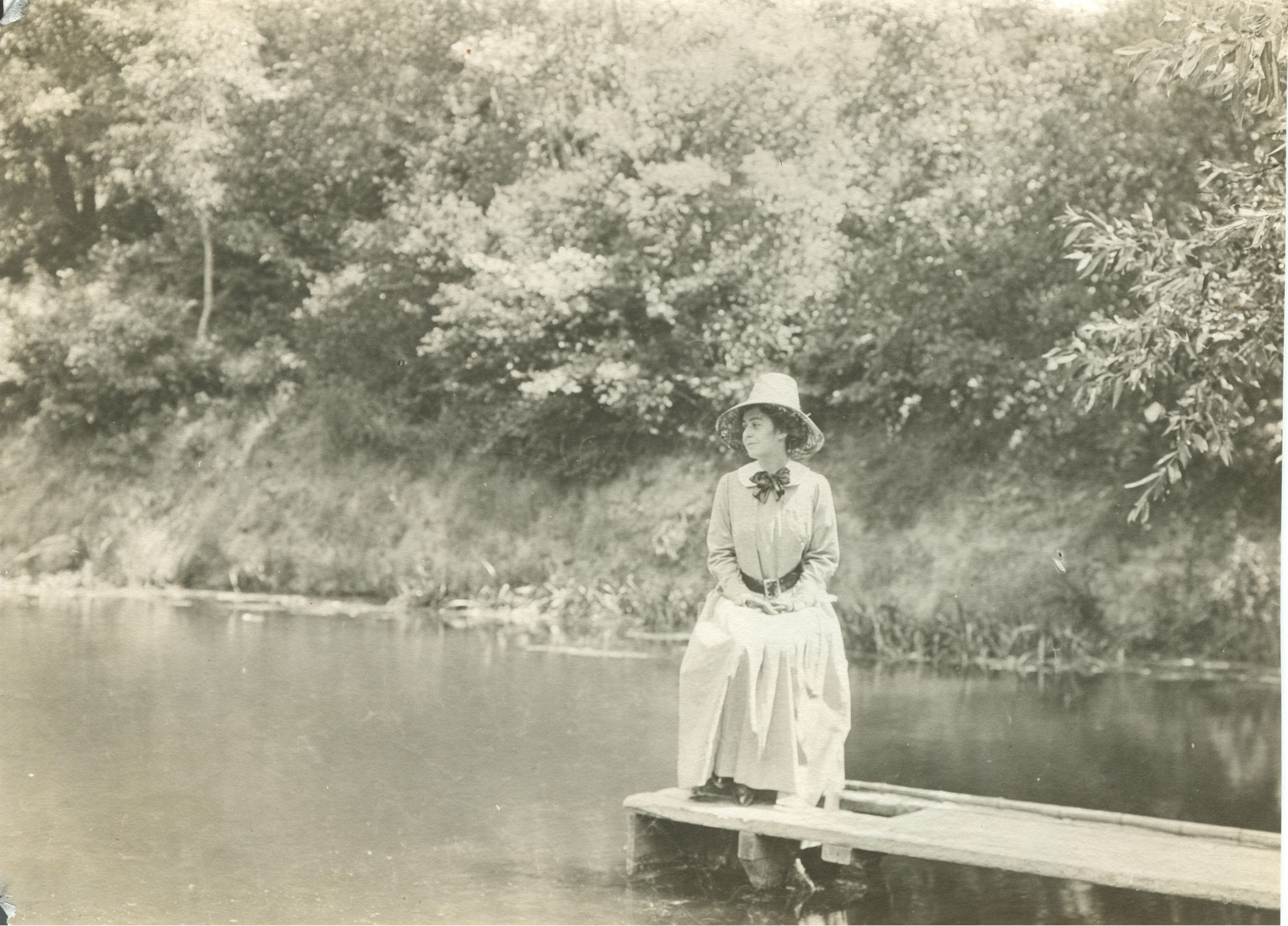 A seated woman was photographed gazing across a lake on the Tevis Estate. NOV012Collection