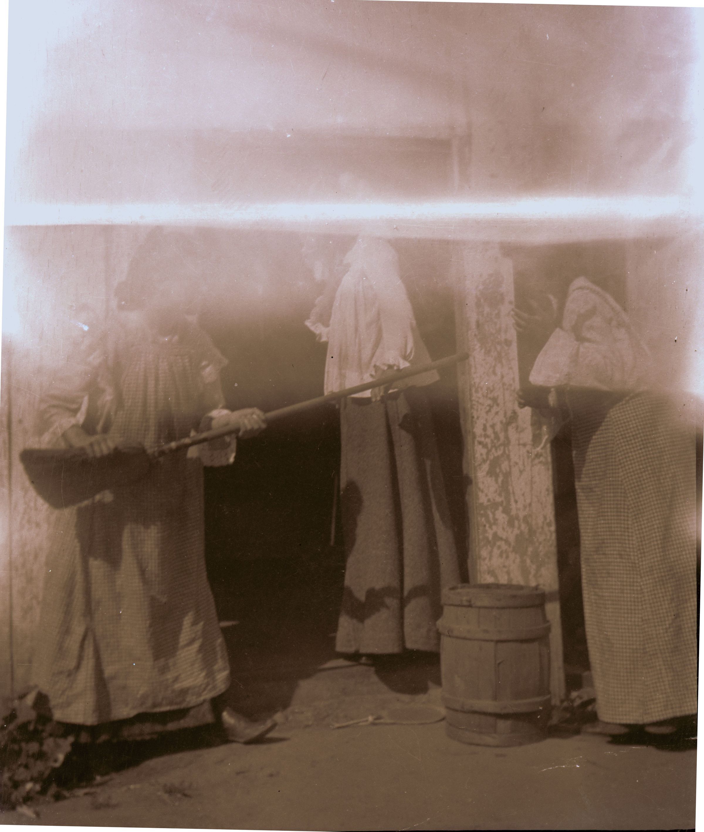 One woman feigning an attack gesture with her broom. Middle lady recoils; intended recipient of being poked is at the ready with a piece of wood. MUS013Collection