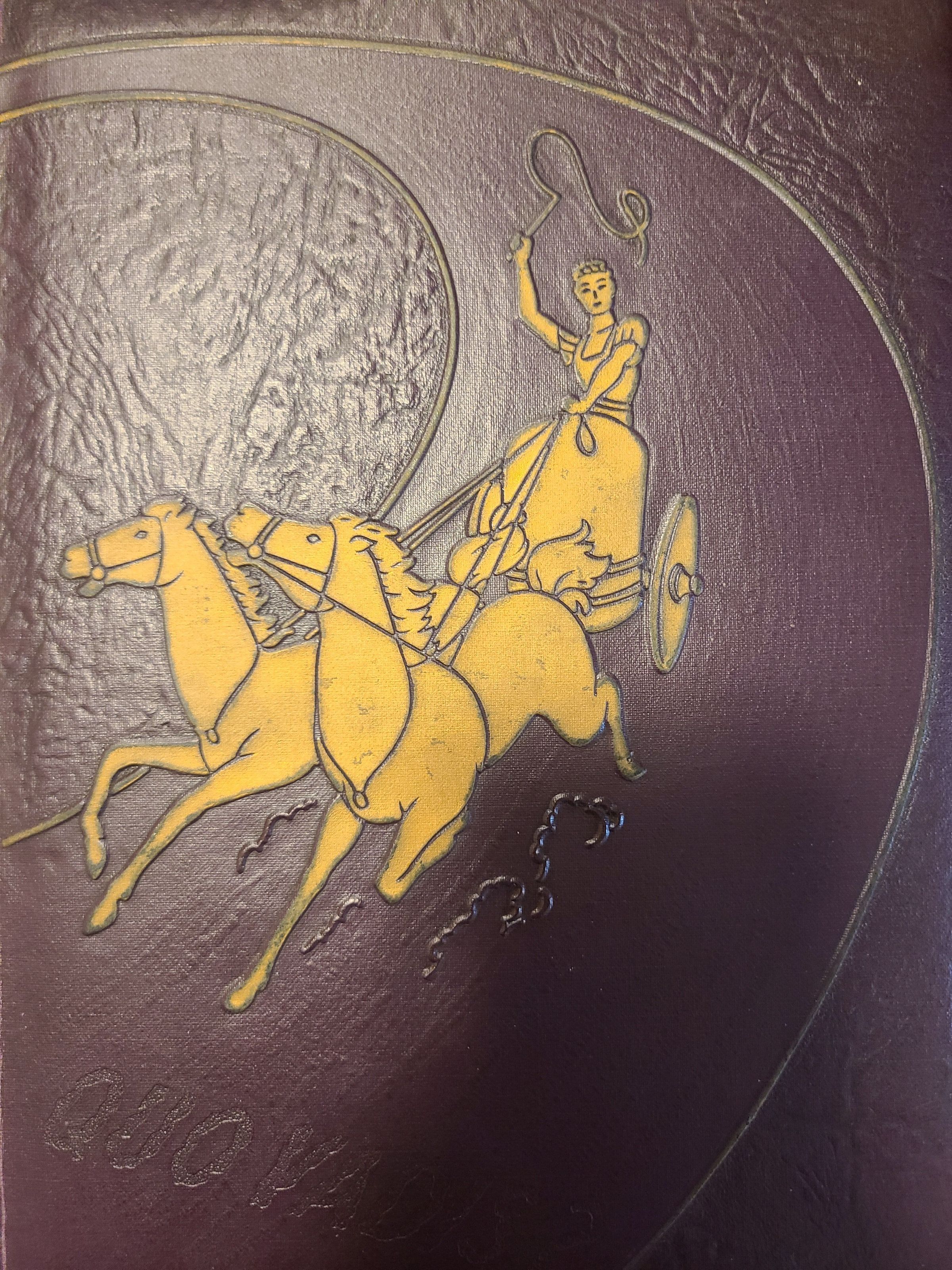 Velvet background with golden chariot graphic.