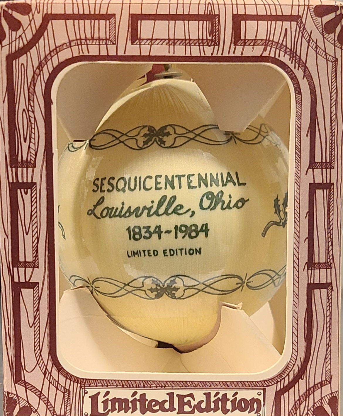 Limited Edition. In box. Juilliard Home depicted on one side and commemorative sesquicentennial Louisville, Ohio 1834-1984 on the other side. Colors are pale green with dark green lettering and designs.