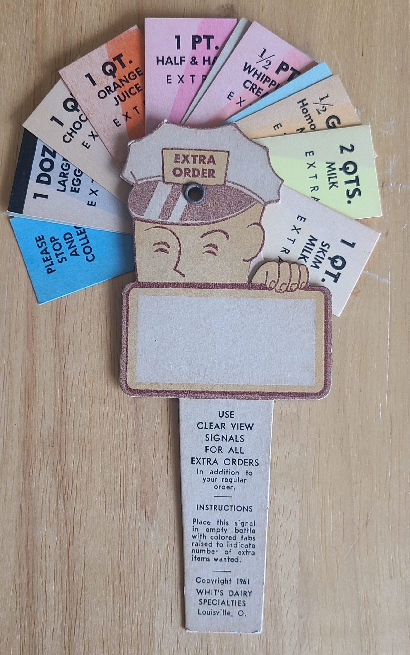 Cardboard marker to signal extra orders needed with regular dairy delivery.