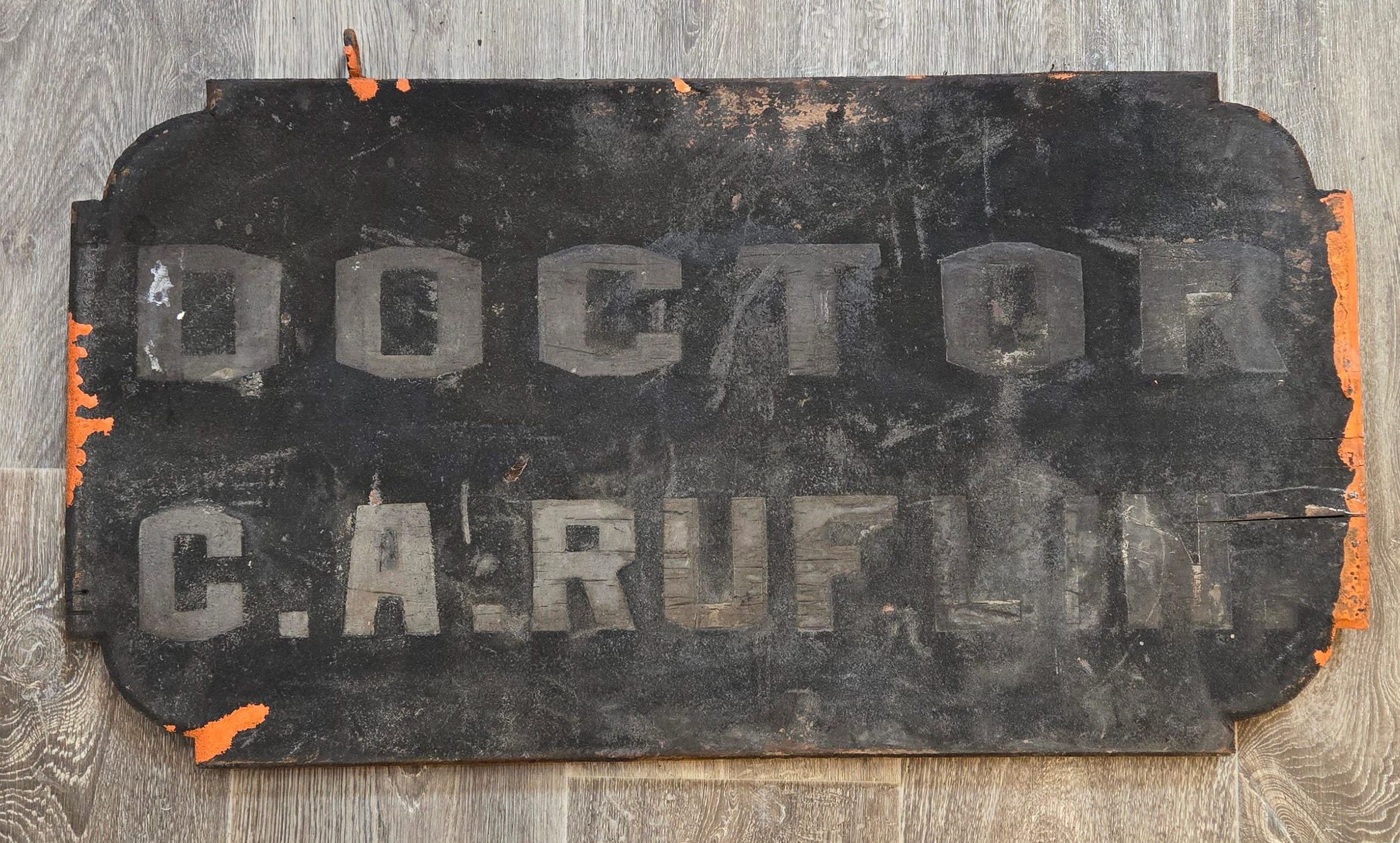 Burnt wood sign for Dr. Ruflin office location at 403 West Gorgas St. that was located in the attic of the home that caught fire on May 17, 1975. The sign survived. You can find the interesting history about this home at the museum.