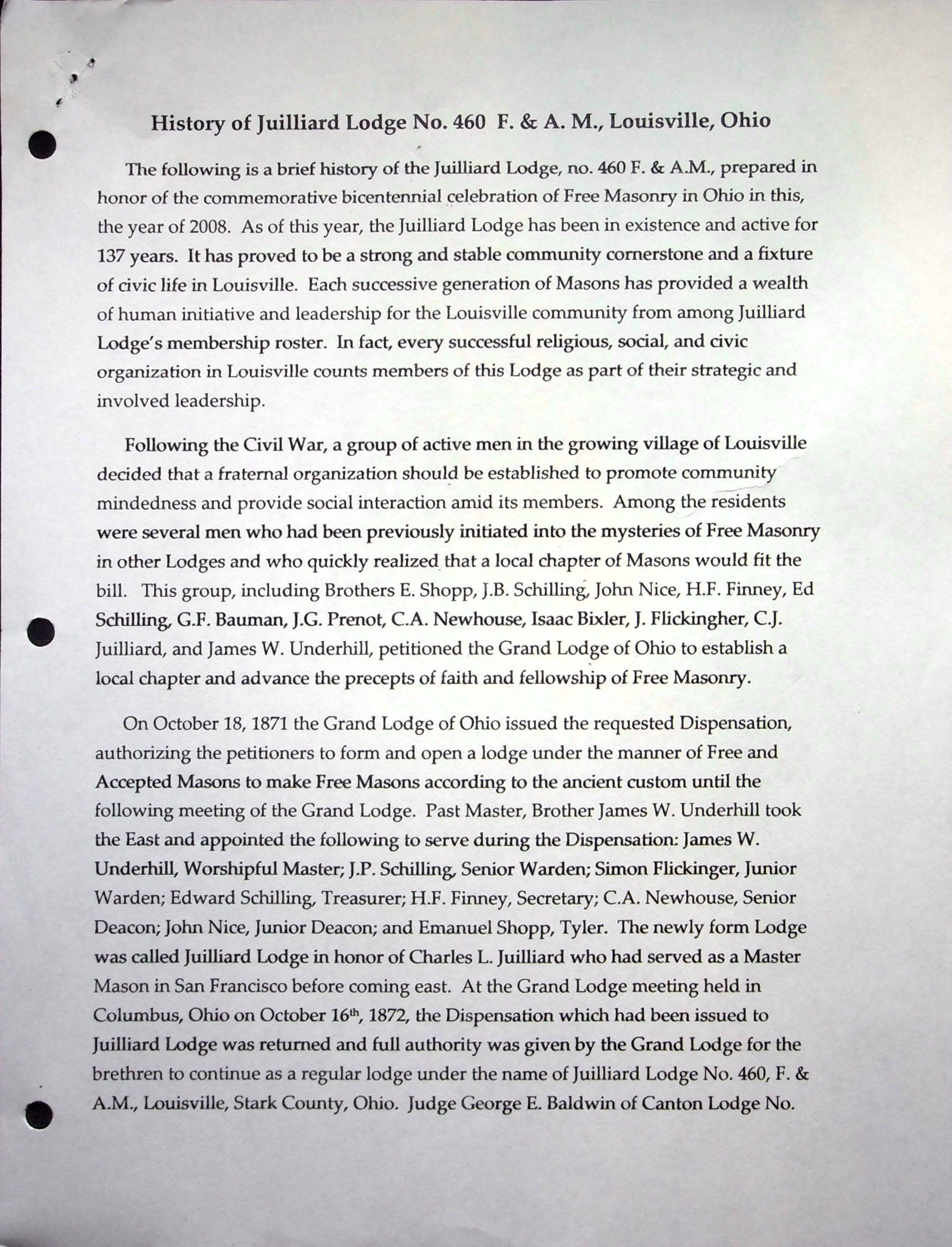 Black notebook with 17 pages of Louisville Masonic history up through 2008 compiled by Gordan Broome.