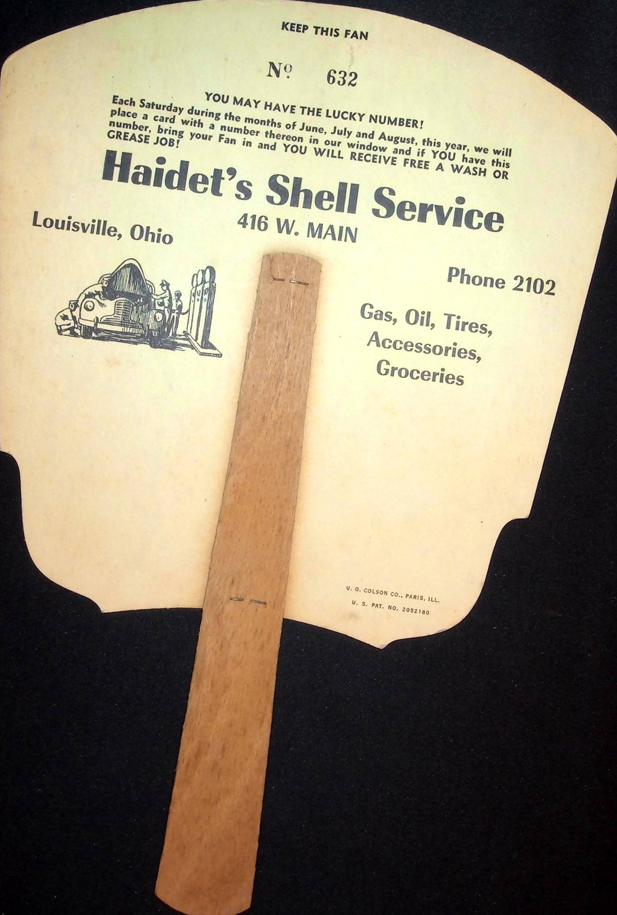 Cardboard advertising fan that included a lucky number to receive a free car wash or a grease job at the Haidet's Shell Service located at 416 W. Main St