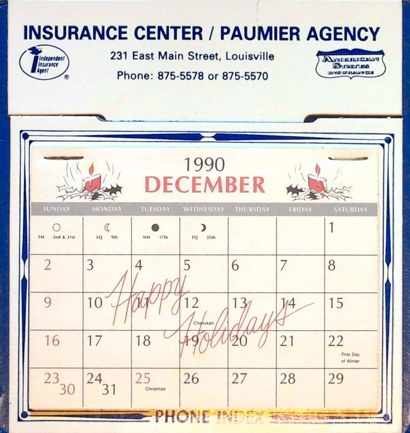 Advertising calendar for Paumier Agency (Insurance) from 1991 (starts on December 1990). Includes a phone index.