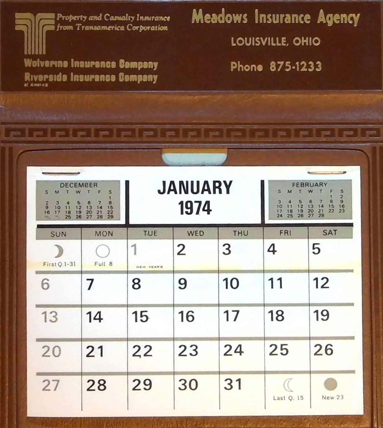 Meadow's Insurance Agency desk calendar from 1974