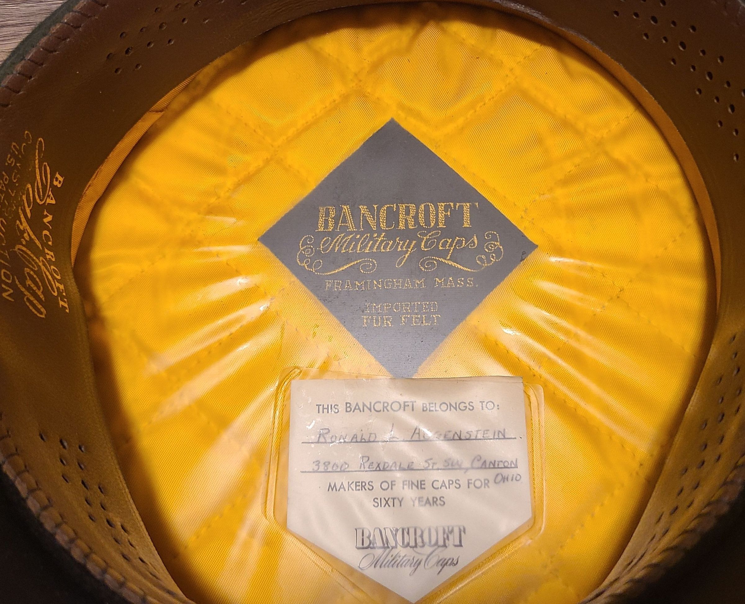 An Army Cap from Bancroft Military Caps. This officer cap belonged to Ronald L. Augenstein. The cap is from the Vietnam era.