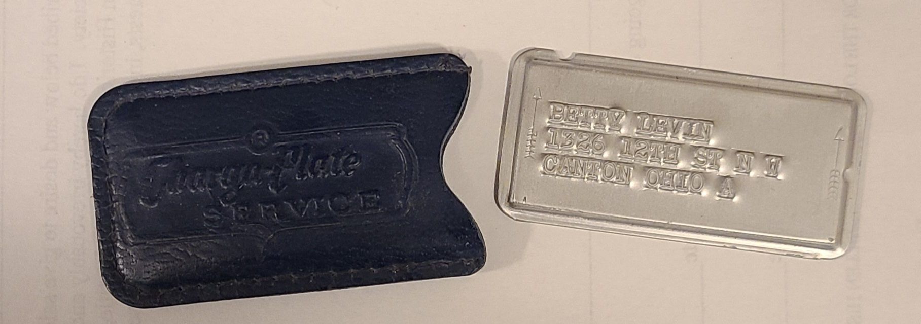 Blue leather case that holds a metal plate engraved with buyer's name. This would be used by retailer to collect purchaser information to charge to their account. The back of leather case says Akron, Ohio.