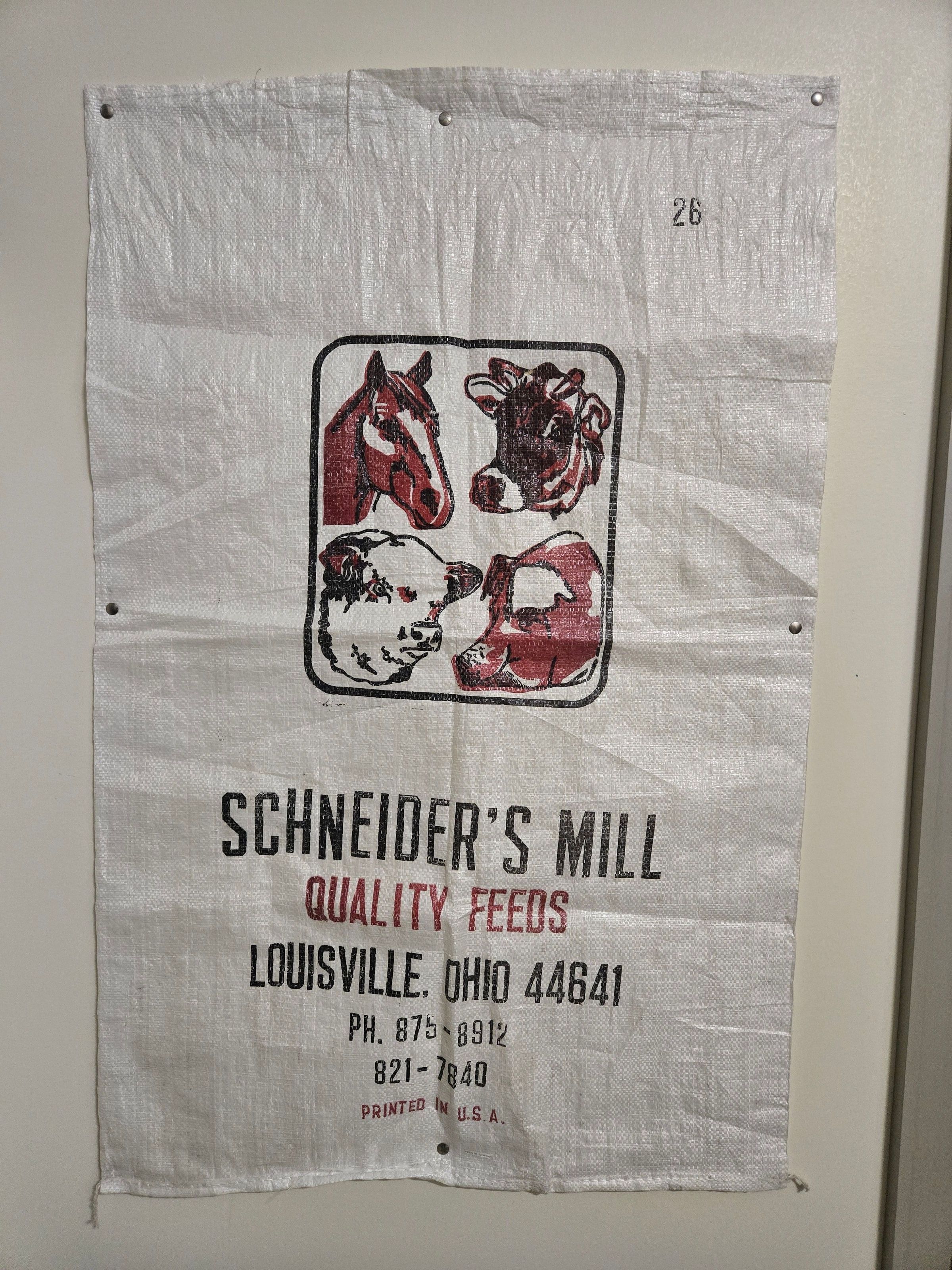 White burlap feed sack 25" x 39" Schneider's Mill Quality Feeds Louisville, Ohio 44641 PH. 875-8912 821-7840 printed in the U.S.A.