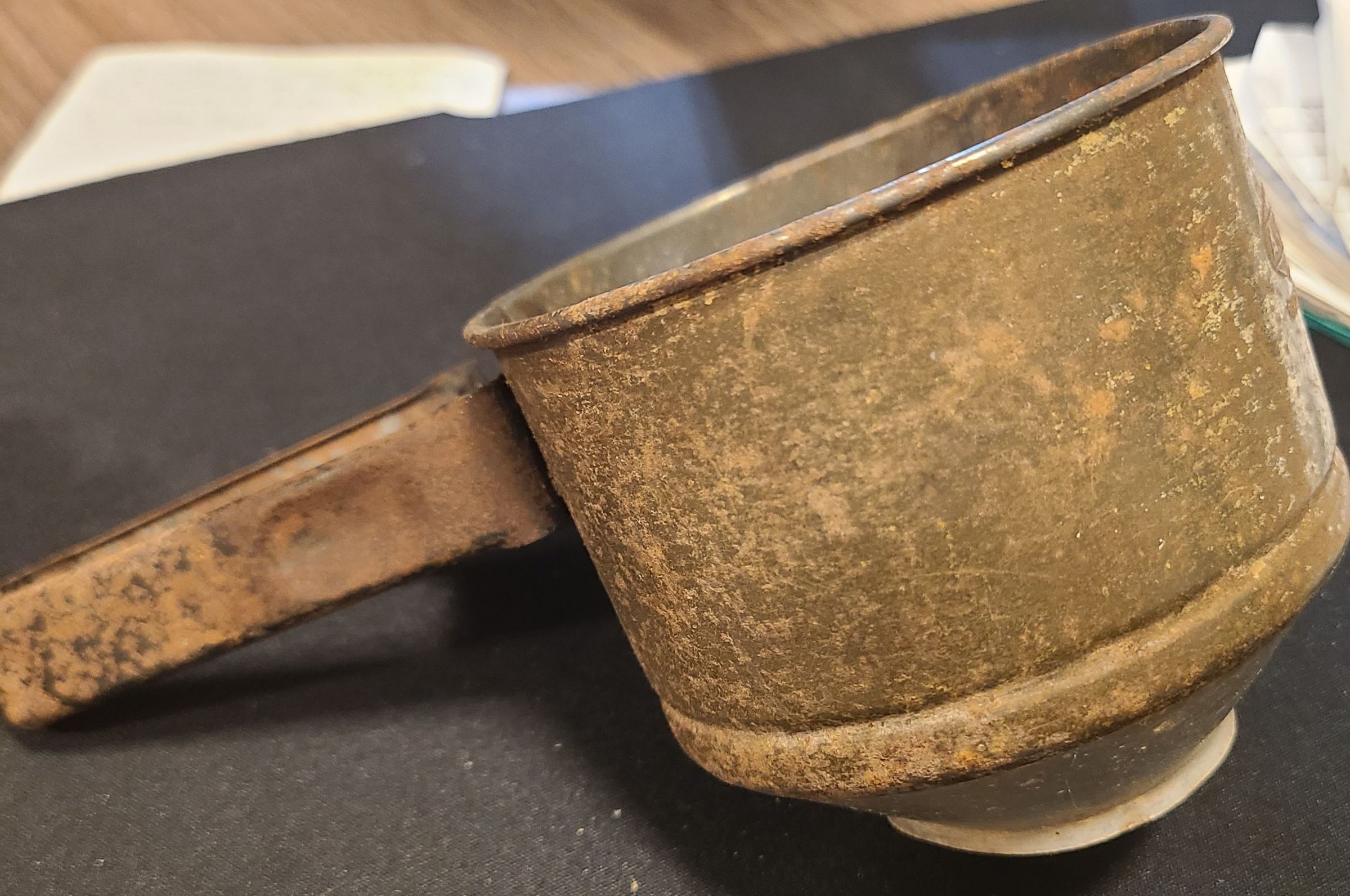This kitchen instrument is called a flour sifter. It was used to sift impurities from the flour such as bugs, bits of husk, and lumps to ensure flour quality.