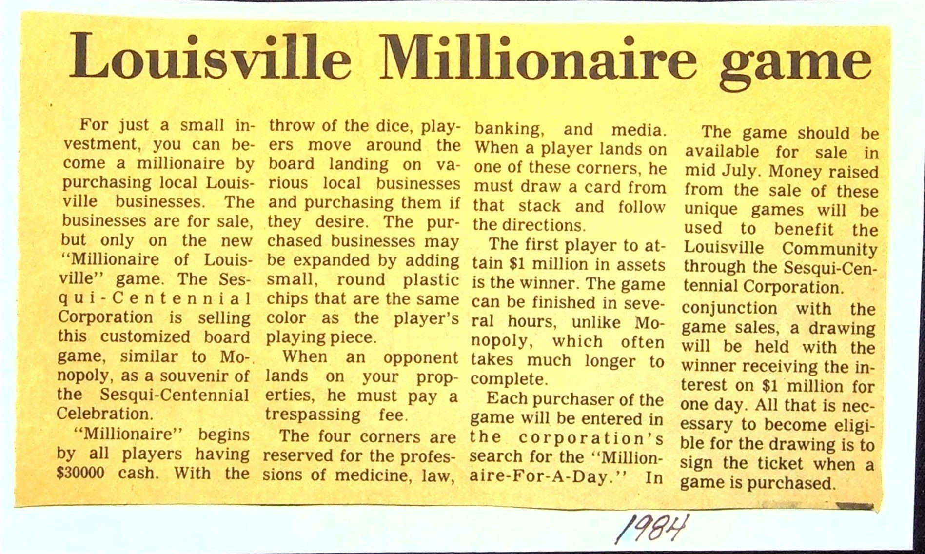 Louisville Millionaire Game Piece, From 1984