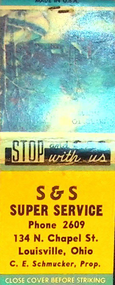 "Stop and Gas with us". Winter scene with "Road to Home". Gold and blues. 3 matches remaining in the book.