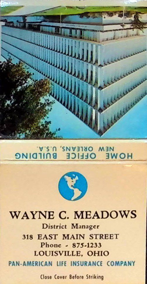 White with blue lettering and picture of home office building in New Orleans. Full set of matches. Inside "No father away than your telephone" and a business opportunity as a Career Life Underwriter job advertisement.