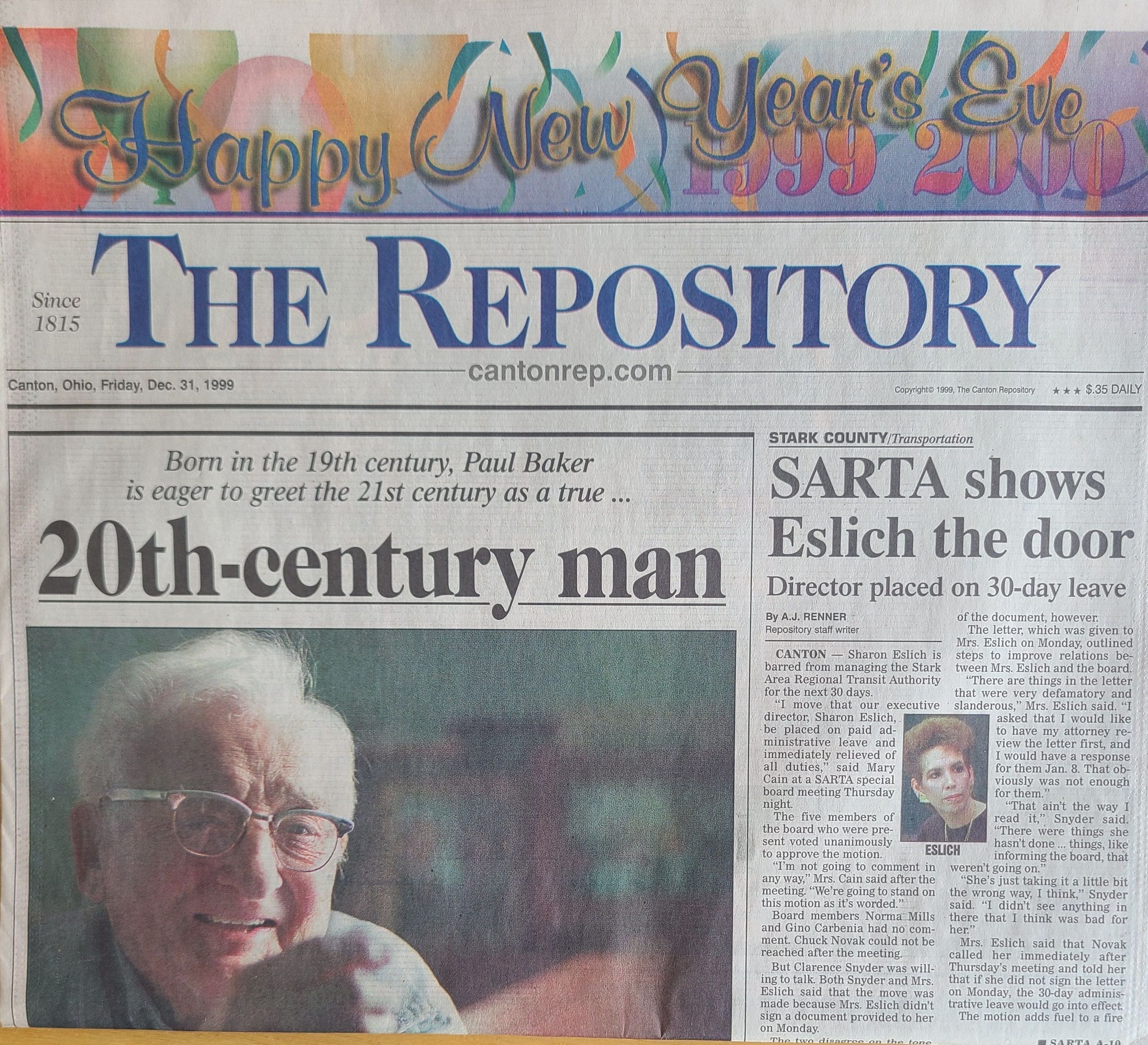 This newspaper is the 1999 December 31st edition of the Canton Repository. This edition addressed the new year along with the new millennium.