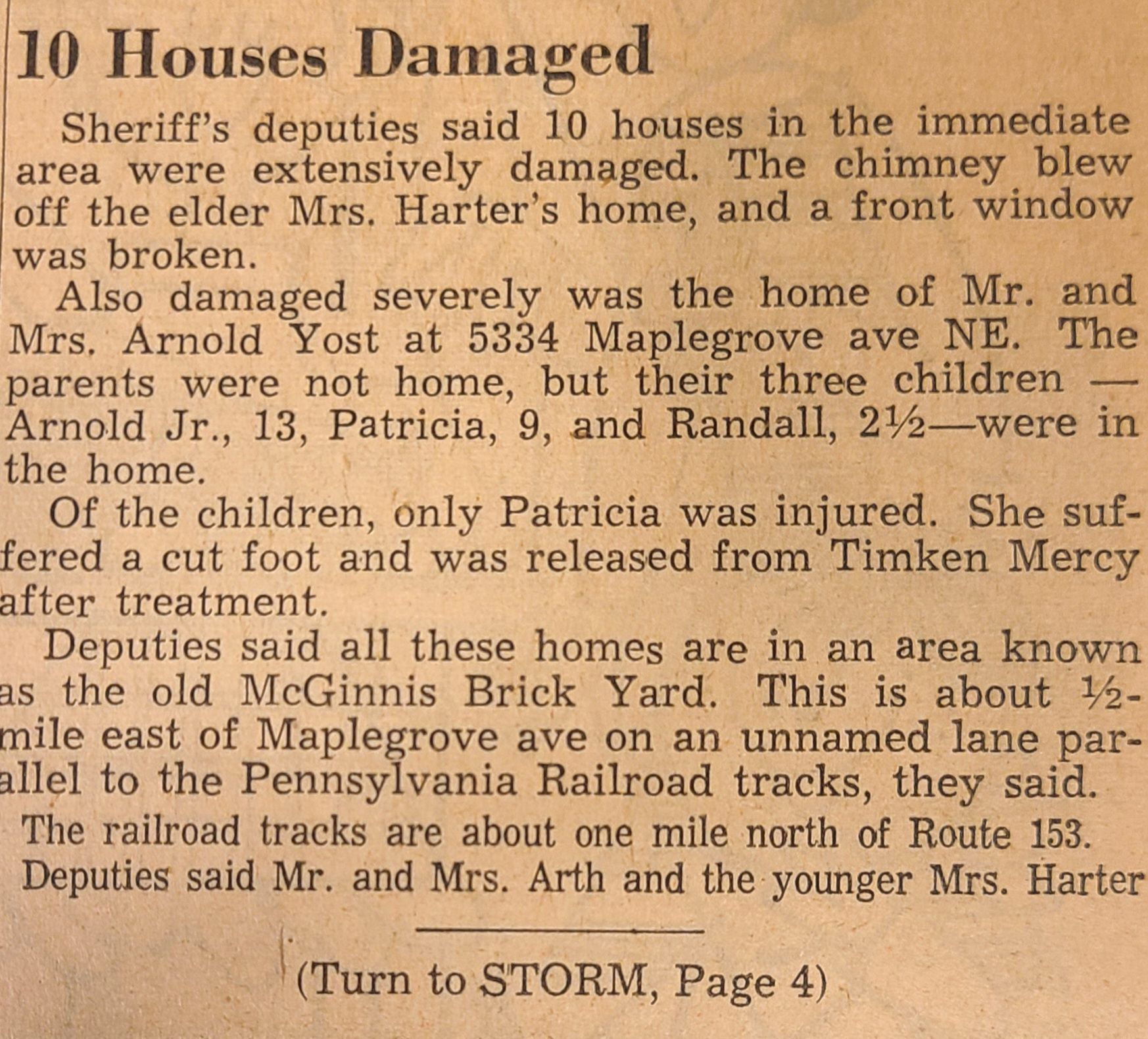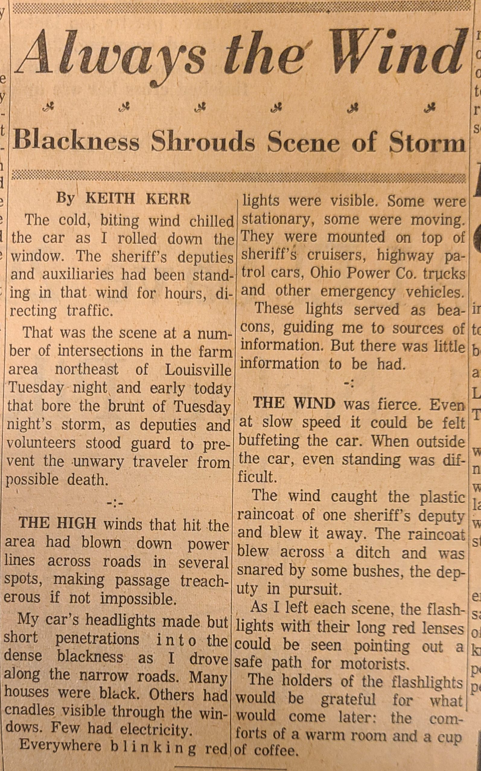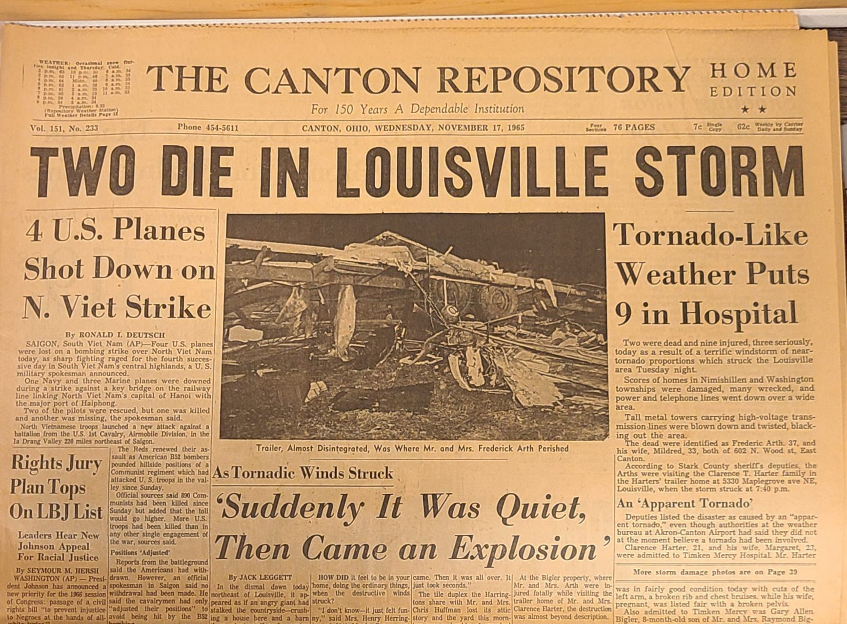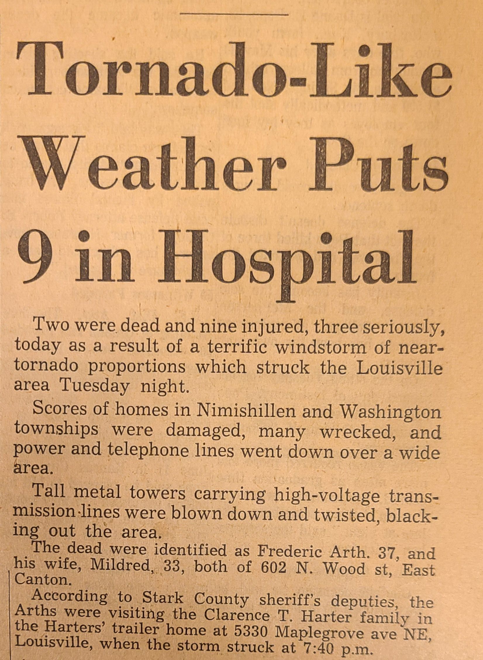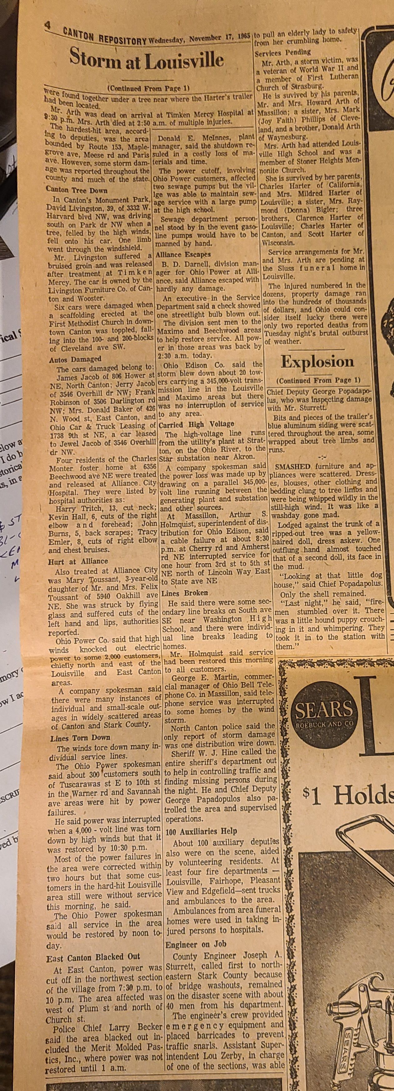 Newspaper articles and pictures from The Canton Repository describing the Nov. 17, 1965, describing the unexpected early morning tornado that took two lives, injured others, and destroyed property in Louisville.