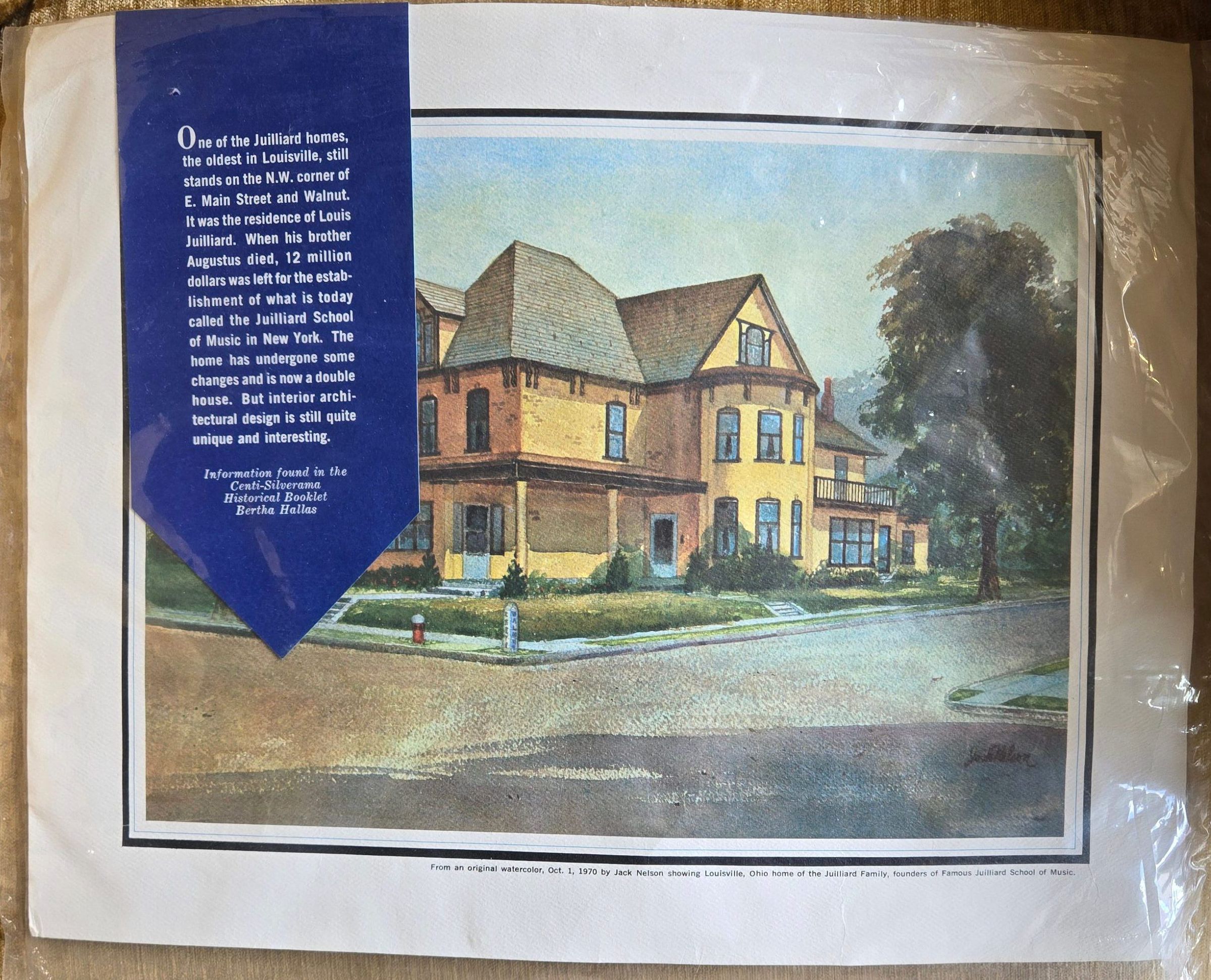 From an original watercolor October 1, 1970 by Jack Nelson showing Louisville Ohio. Home of the Charles Julliard family.