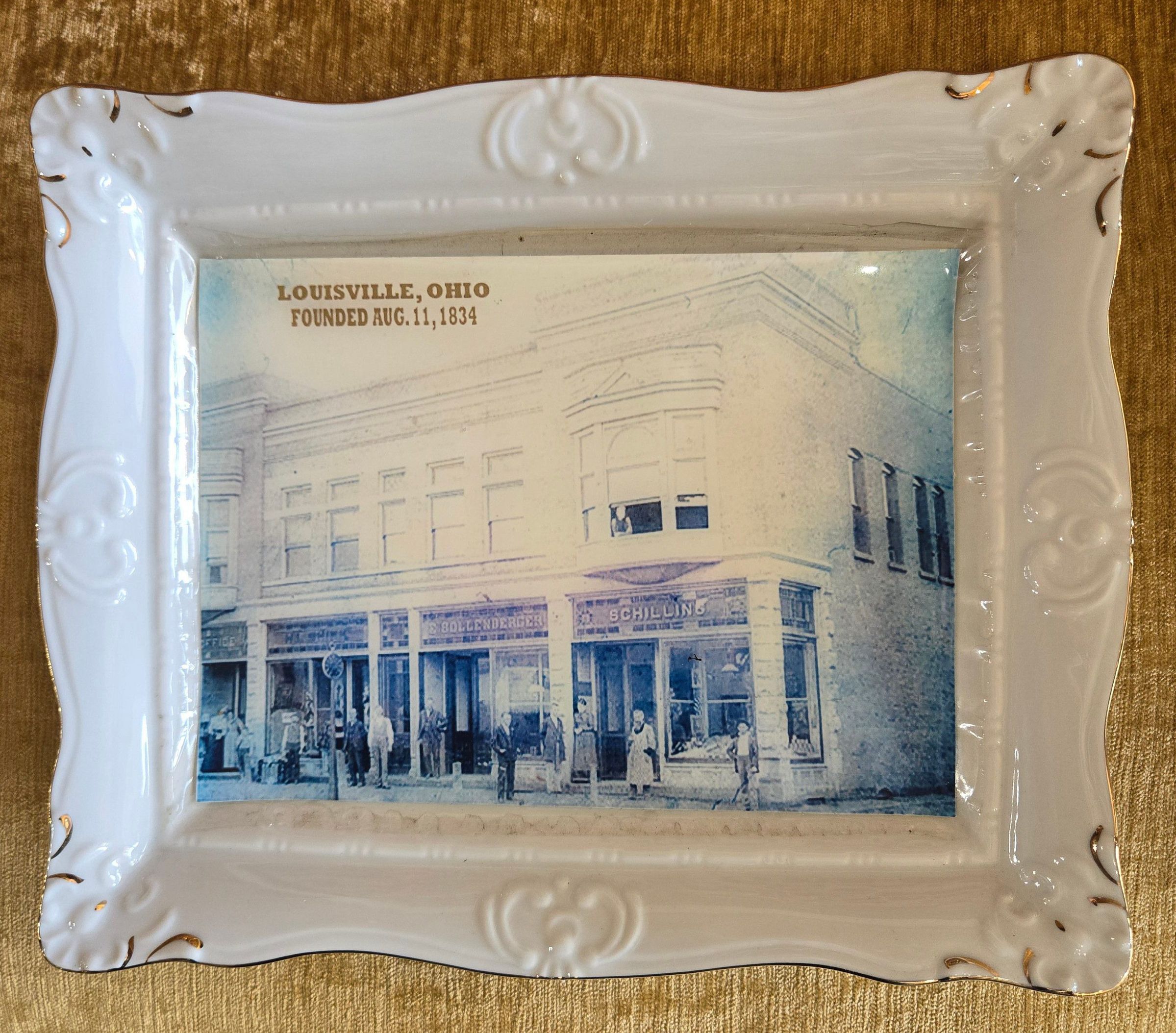 White with gold edging. No markings. Picture of the Schilling Block from early years.