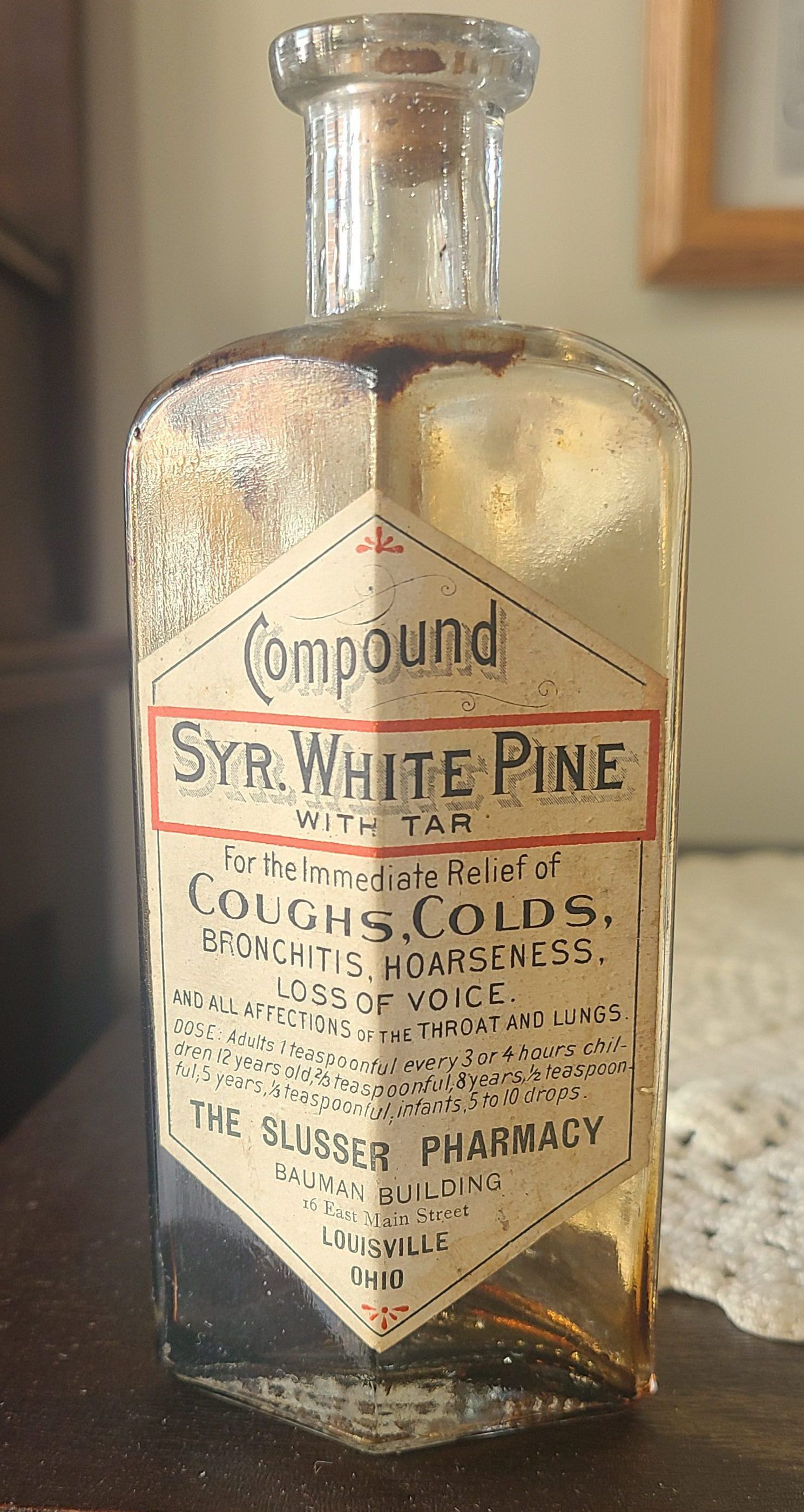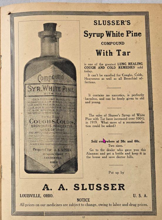 Syrup White Pine with Tar for coughs and colds sold at The Slusser Pharmacy in Louisville, Ohio.