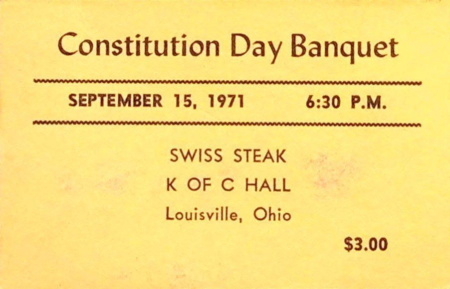 Yellow, Constitution Day Banquet Card for September 15, 1971 at 6:30pm in Louisville Ohio.